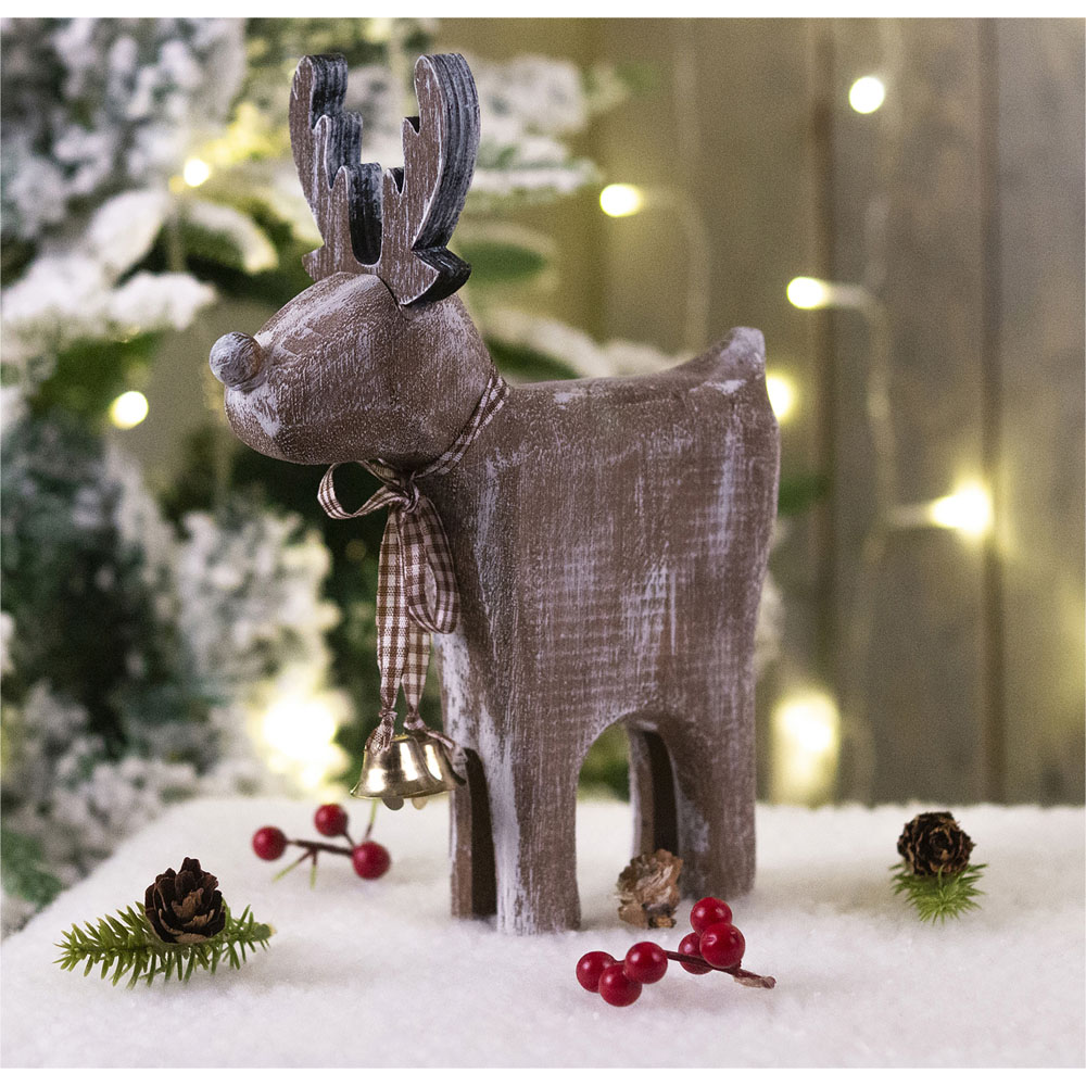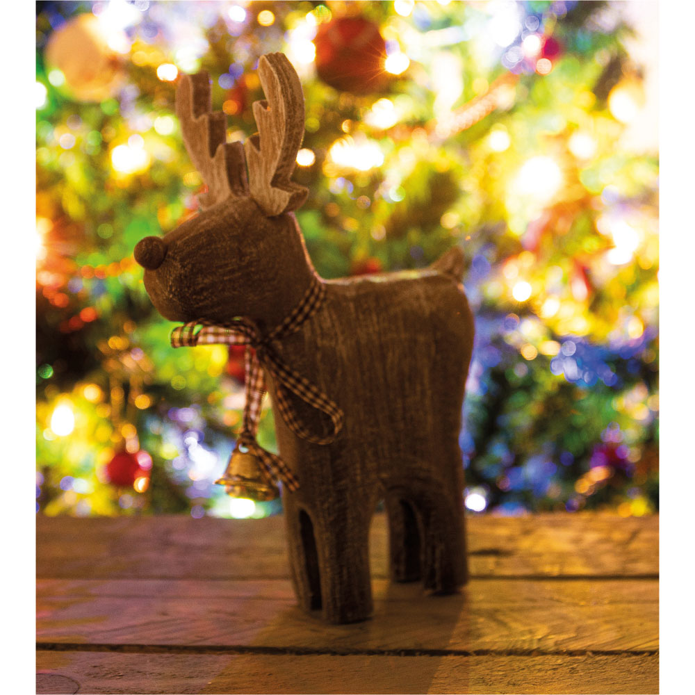 Create a sense of style this Christmas with the St Helens Brown Wooden Reindeer Decoration. Rustic and beautiful, the distressed finish gives it a traditional yet trendy look. This reindeer will make perfect decor on window ledges, coffee tables, and anywhere you want to create a wonderfully festive atmosphere. Also, it is dressed for the occasion with a very jaunty brown check collar topped with Christmas bells. Size: 22 x 8 x 8cm.