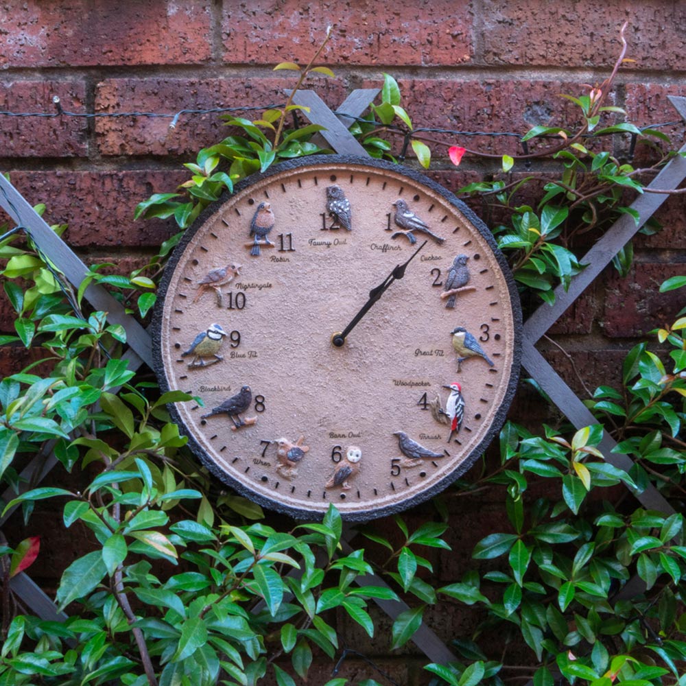 This fabulous decorative outdoor wall clock from St Helens and Home Garden would make a welcome addition to any garden thanks to its charming wild bird design. The clock is hand-painted and made from polyresin, making it long-lasting and suitable for the rigours of outdoor use. The clock is supplied with a key slot, making it extremely quick and easy to mount on outdoor walls, fences, summer houses, conservatories and sheds. Sit back, enjoy the beauty of your garden and watch time go by. The clock features a tawny owl, chaffinch, cuckoo, great tit, woodpecker, thrush, barn owl, wren, blackbird, blue tit, nightingale and a robin. The clock requires a 1x AA battery (not supplied).