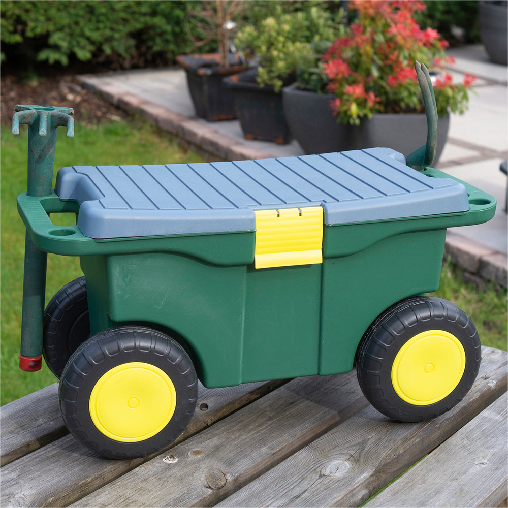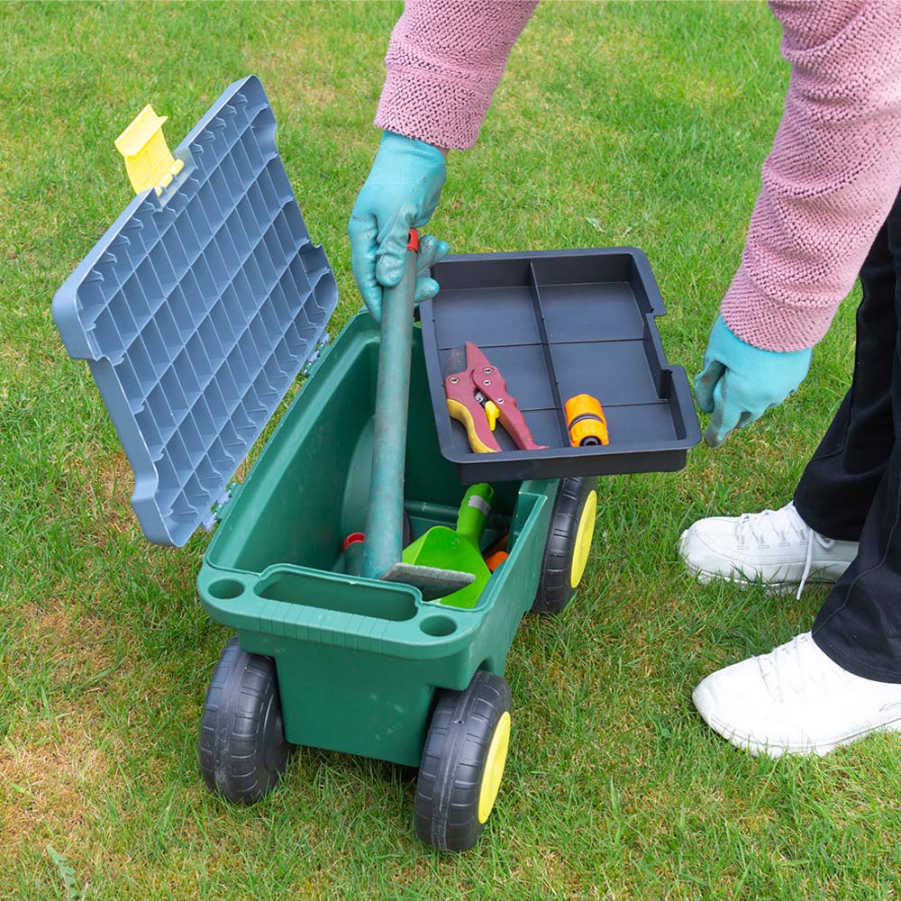 This multi-use garden trolley from St Helens is super handy. There is a large compartment under the seat for storing tools and supplies such as trowels, gardening gloves and string. There is also a removable tray, which is perfect for storing items such as seeds and plant labels. The trolley has four wheels and two handles, making it easy to move your tools around the garden. Sit on the sturdy seat when you are weeding or just when you feel like a rest and want to admire your handiwork. The garden trolley is made from strong plastic to ensure many years of use.