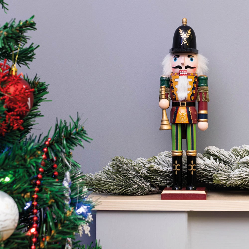 Bring festive cheer to your home with a classic wooden nutcracker soldier dressed in a vibrant green and red uniform, complete with gold tassel detailing and a charming bugle, making it a standout addition to any Christmas setting. Standing at thirty centimetres tall, this decorative piece draws on German tradition, symbolising good luck and protection for your household. Its sturdy flat base means you can display it proudly on window ledges, mantelpieces or coffee tables, creating a joyful focal point wherever it's placed.