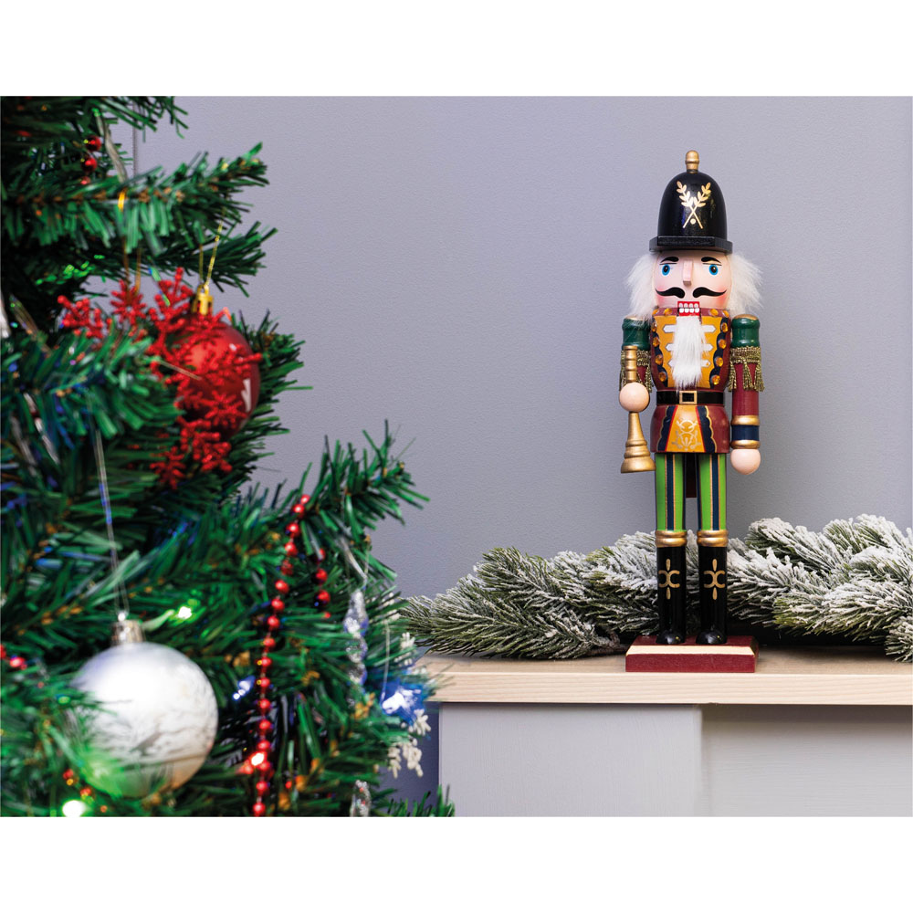 Create the perfect festive atmosphere at your home with this St Helens Multicolour St Helens Multicolour Christmas Nutcracker with Bugle. The green and red uniform is a festive combination and looks particularly striking with the twinkling lights of your Christmas tree. In the German tradition, nutcrackers are symbols of good luck and protect your home by warding off evil spirits. This nutcracker decoration stands flat, making it easy to place on window ledges, fireplaces or coffee tables. With it's shiny finish it makes for a perfect ornament for your Christmas decor. Dimensions: 300 x 75mm.