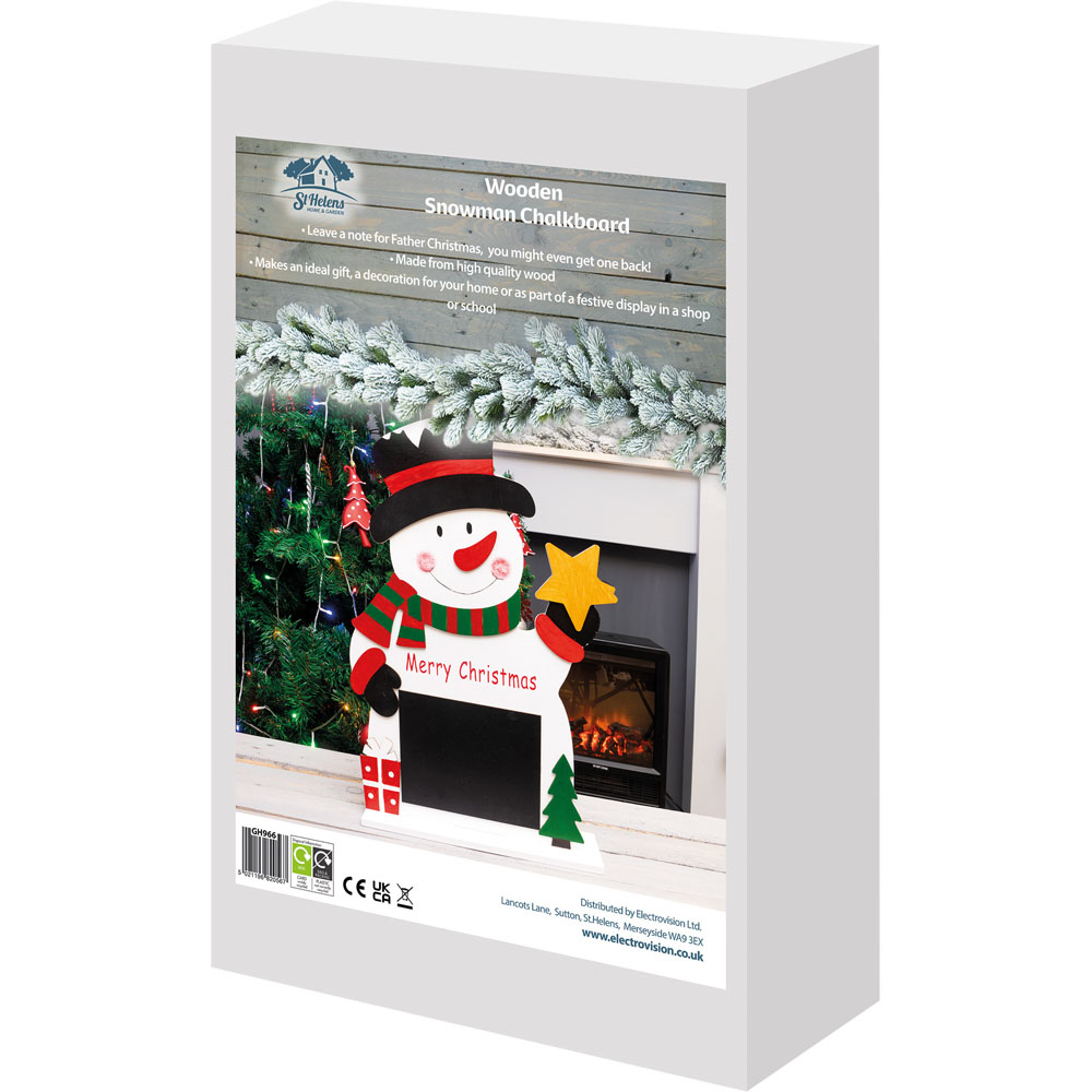 Write a message for Santa on this St Helens Multicolour Festive Wooden Snowman Chalkboard. Made from high-quality wood, this beautiful snowman with chalkboards looks very festive, thanks to its snowman design and green and red colours. Children can use the blackboard to leave a message for Father Christmas or Santa Claus on Christmas Eve. You can also use this snowman chalkboard to list party events, special menus and more. Plus, the snowman would make a thoughtful gift for family and friends. Easy to use, simply place it as a quirky decoration in your home or in shops or schools as part of a Christmas scene or display. Size: 50 x 31 x 9cm.