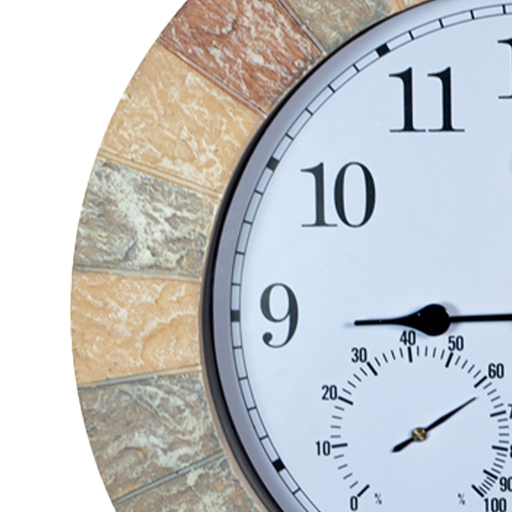 This fabulous decorative outdoor wall clock with thermometer and hygrometer from St Helens and Home Garden would make a welcome addition to any garden thanks to its pleasing sandstone effect design. The clock is hand-painted and made from polyresin, making it long-lasting and suitable for the rigours of outdoor use. Supplied with a key slot making it extremely quick and easy to mount on outdoor walls, fences, summer houses, conservatories and sheds. Sit back, enjoy the beauty of your garden and watch time go by. The clock features a handy thermometer which displays the temperature in degrees Fahrenheit from -60 degrees F to 100 degrees F and a hygrometer which measures the percentage humidity of the air. The clock requires a 1x AA battery (not supplied).