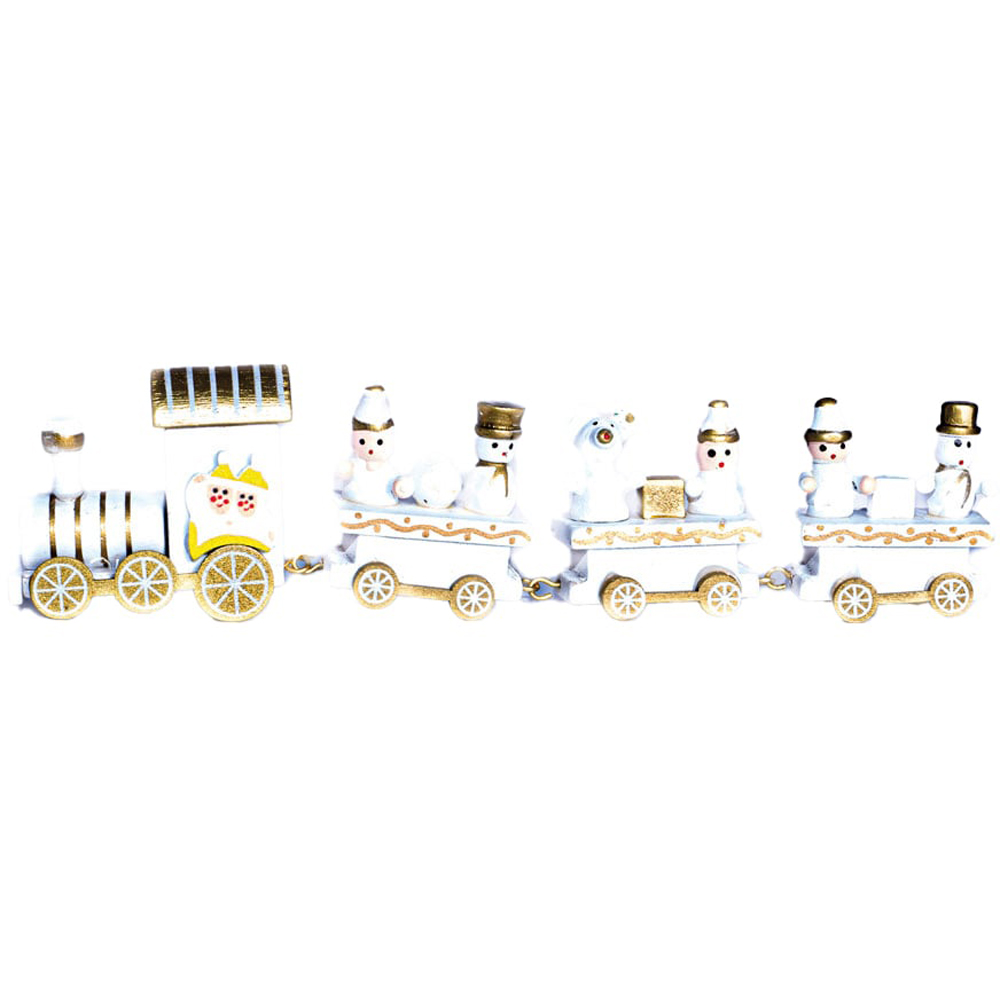 Make a timeless addition to your home this festive season with this St Helens White and Gold Wooden Christmas Train Set Decoration 20cm. The white and gold set includes an engine and three carriages, all decorated in festive colours. Made with high-quality wood - this set exudes a wonderfully old-fashioned feel. The train is also adorned with festive figurines such as snowmen, snowball, and presents. Each carriage is detachable - arrange them in any order you'd like, making it a versatile decoration. This set would make for a thoughtful Christmas gift, but it would also look great under your Christmas tree or displayed on a coffee table, window sill, or fireplace.