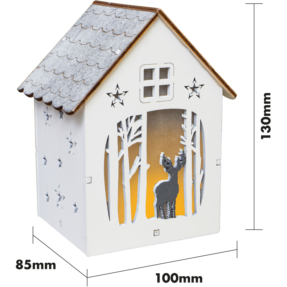 Add beauty and elegance to your festive decor with the St Helens White Light Up Wooden Festive Scene. This beautifully crafted light-up festive scene will look perfect on your window sill or tabletops, in fact, any place you want to create a festive atmosphere. This festive scene is a fantastic alternative to the traditional Christmas candle bridges. It features festive carvings of reindeer, Christmas trees and stars and is presented in the shape of a quaint house. Also, the light is placed inside the house and shines through the carvings to create festive silhouettes. Easy to use, the scene is battery-operated by one CR2032 battery (not supplied). Size: 13 x 10 x 8.5cm.