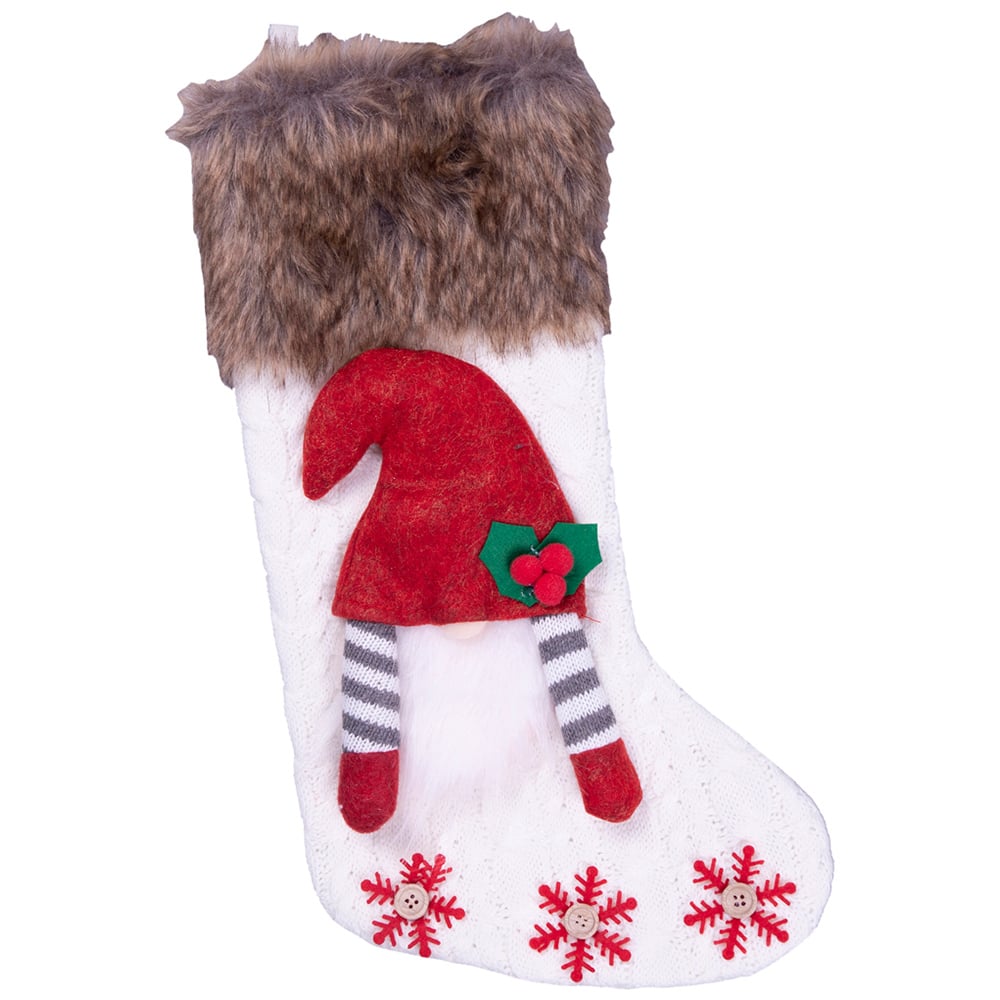 Enjoy the well-loved Christmas traditions with this St Helens Luxury White Christmas Gonk Stocking. Beautifully knitted with a fur lined trim featuring a felt and wool gonk with a white bushy beard - it is large enough in size to fit in all those little Christmas surprises. Simply hang from fireplaces or staircases using the integral felt hook. Young and old will love these beautifully designed stockings. Size: 23.5 x 42cm.