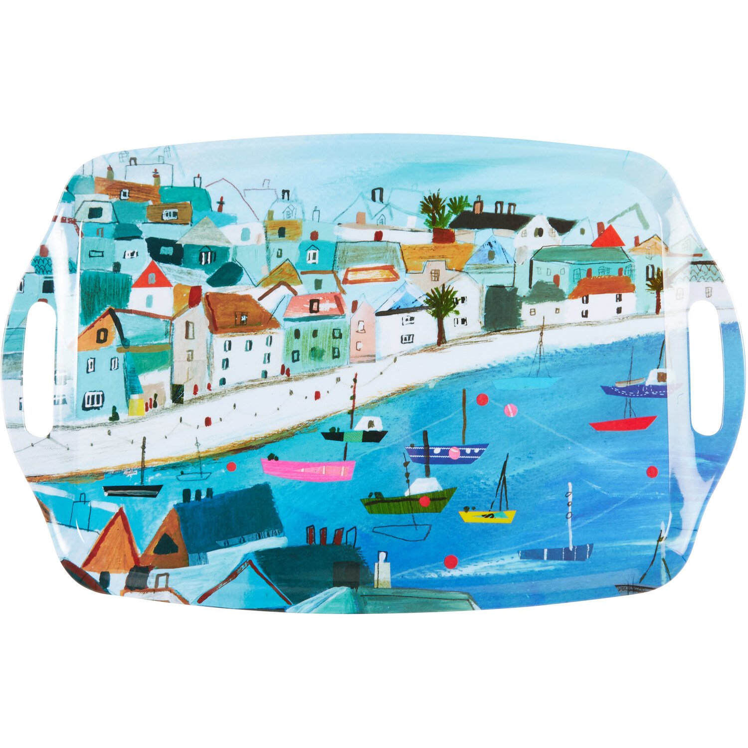 Add a coastal vibe to your living room, bedroom or kitchen with this St Ives Tray. This beautiful tray features a vibrant seaside cornish scene for a charming look. Excellent for serving and transporting your favourite drinks or bowls of snacks or for storing trinkets and accessories. A superb decorative and functional tray, it's also lightweight, enduring, and simple to clean for your convenience.