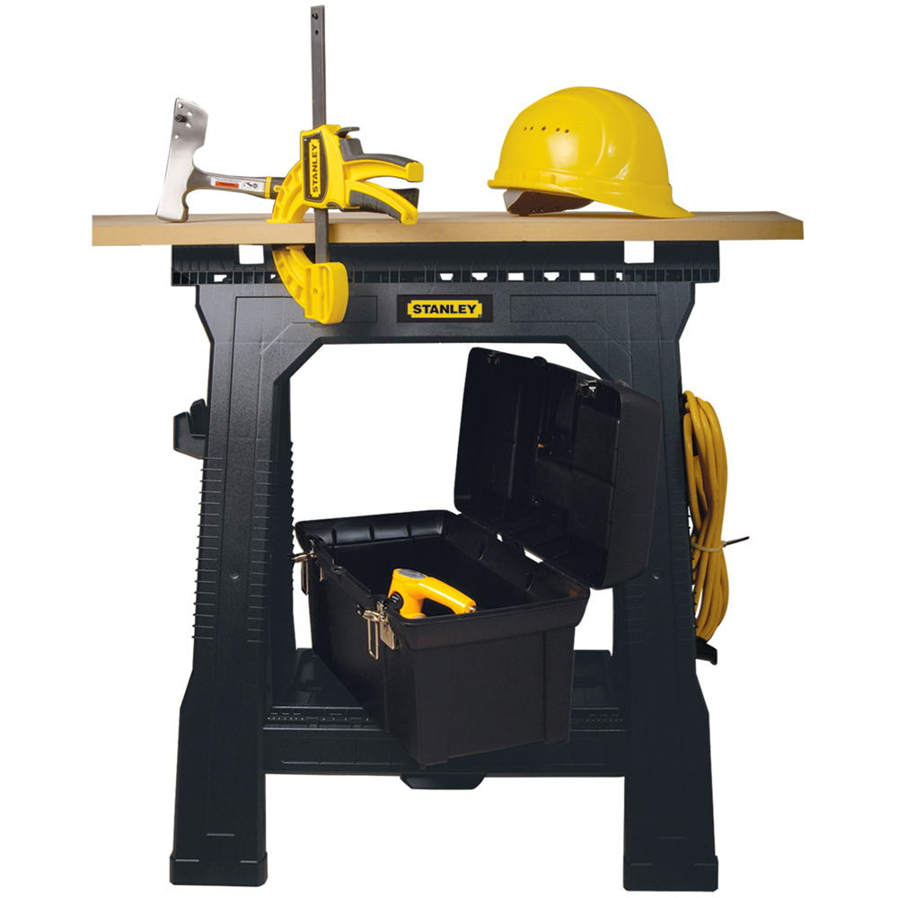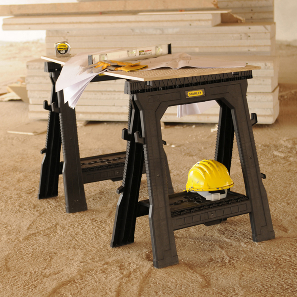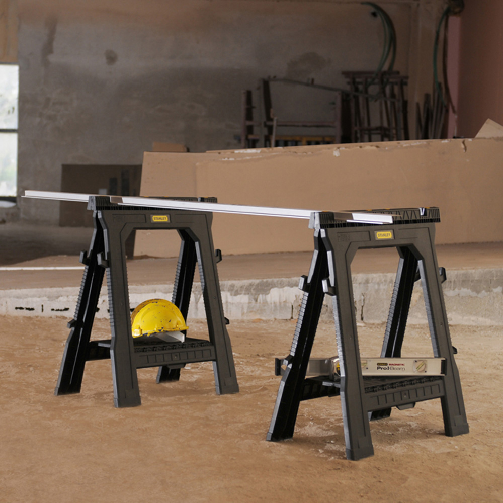 The Stanley 70-713 Folding Sawhorses with a robust polypropylene structure and integrated grooves to hold and clamp materials and top rubber pads/points to prevent materials slipping. They also feature a tool tray to hold power tools and hand tools and side cable hangers.