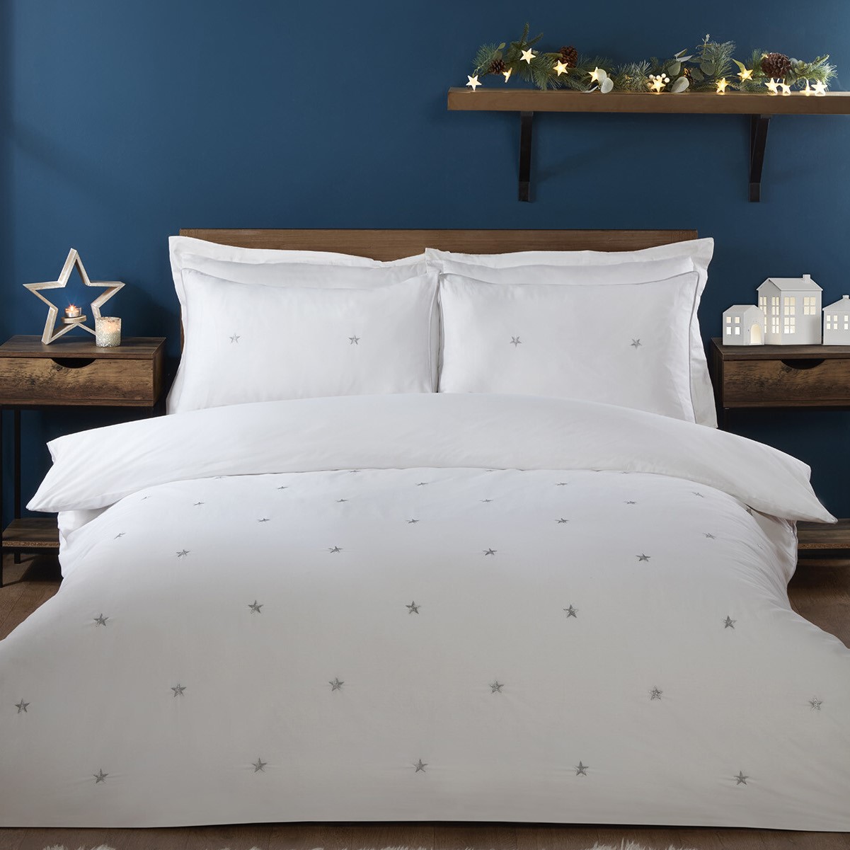 Bring some celestial charm to your home this winter with this Stars Embroidered Duvet Cover and Pillowcase Set. In a simplistic white colour with a sophisticated piped edge, this bedding set is a timeless addition to your room. Made from 100% cotton, it features embroidered stars with a metallic finish which is sure to elevate your decor.