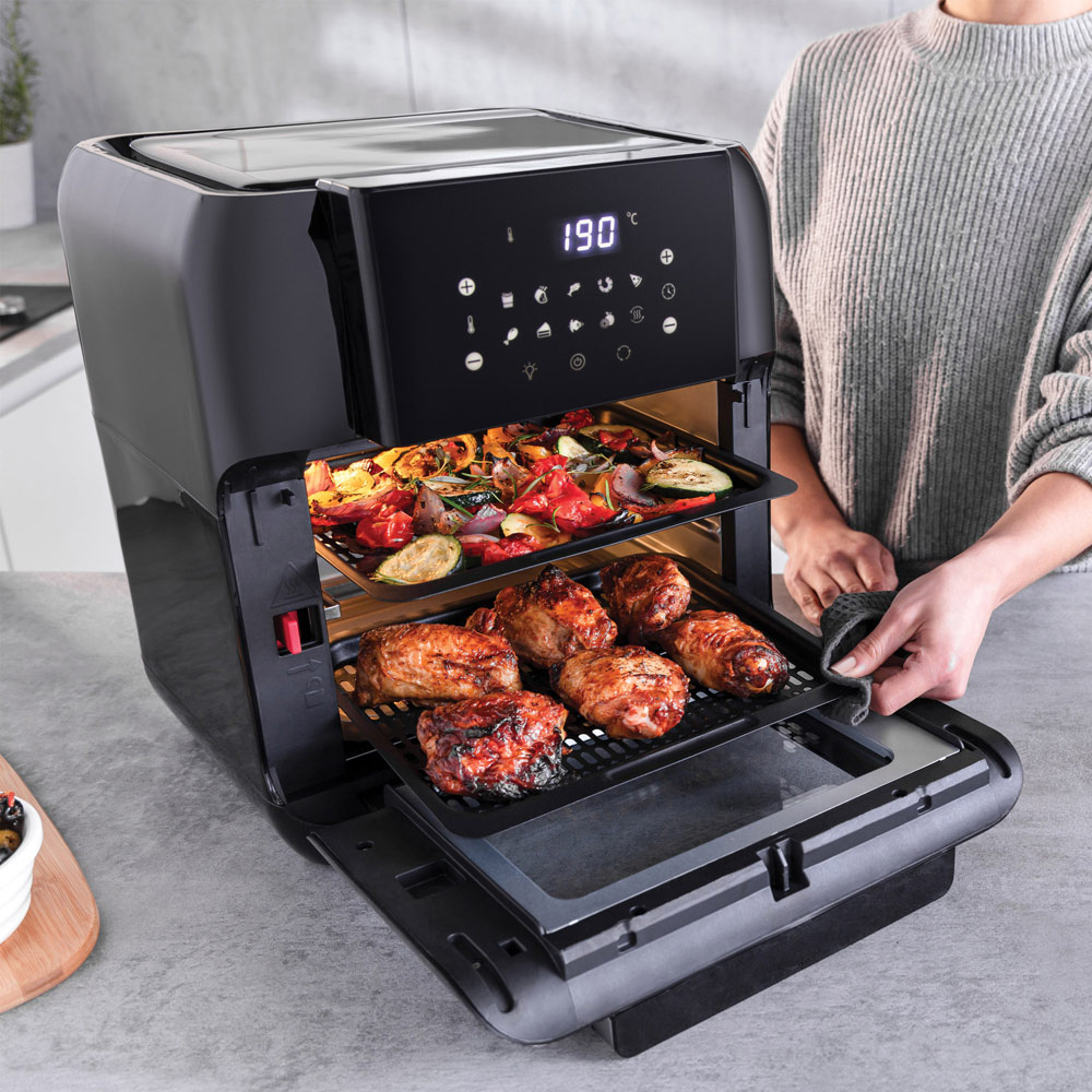 Cook your favourite dishes easily with this Statesman 10-in-1 11L Digital Air Fryer Oven. This kitchen appliance comes with a rotisserie fork and spit, a rotating basket, two grill racks, and a drip tray which doubles as a baking tray. Apart from this, it also includes an eight-piece skewer set for multi-purpose, energy-efficient cooking. Featuring 360° air circulation, the device quickly circulates hot air, cooking faster and giving even cooking results. Easy to use, the ten preset cooking programmes, viewing window and interior light make for a user-friendly cooking experience. Complete with a detachable door for effortless cleaning.