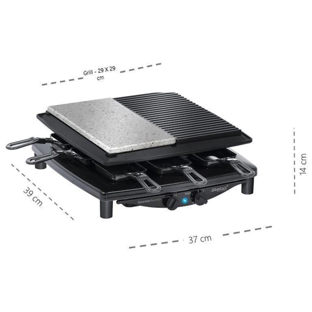 Enjoy delicious meals with the Steba Premium Quality Electric Raclette Grill. This raclette is ideal for cooking and serving six people at once. It has a large non-stick coated die-cast grill plate that collects fat, making your grilling healthier and tastier. The stone plate is scratch-resistant and the eight enamelled pans are durable enough to last for years. Besides this, the raclette grill has an adjustable temperature control setting with an on-off switch making it incredibly user-friendly. The pans are dishwasher safe, so you don't have to worry about the hassles of washing or cleaning.