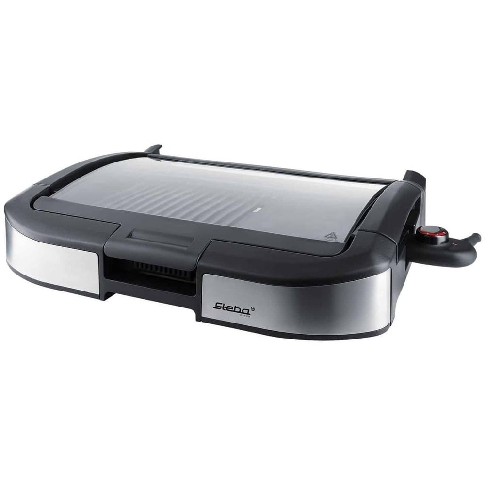 Enjoy flavoursome meals with the Steba Tabletop BBQ with Glass Lid. You can cook delicious steaks, sausages, fish and vegetables perfectly on a solid die-cast aluminium grill plate with integrated heating elements. The glass lid with a lock on the handle ensures tender grilling results without drying out whilst forming an appetising crust. There are no limits to your imagination, use the fat collector as an aroma tray and give your grilled food a special touch with the glass lid closed. It features infinitely variable temperature control and can be kept constant or adjusted variably which is a clear advantage over conventional charcoal grills. The large grill surface with a diameter of 40 x 29cm not only offers grilling fun but is also easy to clean due to its non-stick coating. Excess roasting liquid runs off into a drip tray and enables fat-reduced and almost odourless and smoke-free grilling. Dimensions: 58 x 39 x 11.5cm.