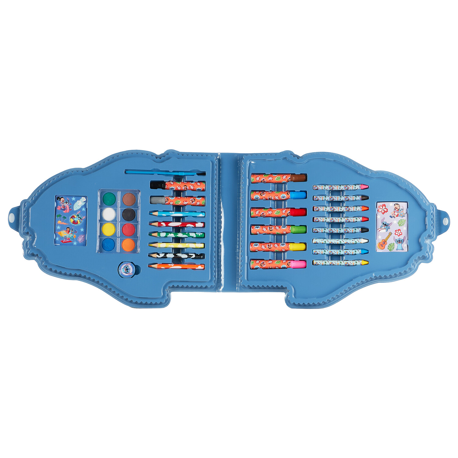 Add a touch of delight to your creative collection with the Stitch-Shaped Artcase. It's a delightful option for both kids and adults, designed to keep everything neat and within reach. Express your creativity with this playful and practical holder, featuring 8 bright markers, 8 colourful crayons, 8 paint pots, a paintbrush, a mixing tray, 6 coloured pencils, a sharpener, and 2 sheets of stickers.