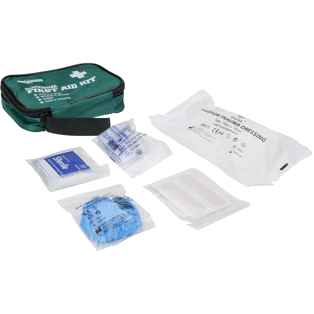 Ensure peace of mind at work with the StoneBreaker Individual First Aid Kit, a compact solution packed with essential items. This first aid kit includes guidance, dressings, a resuscitation face shield, wipes, plasters, gloves, and a burn dressing, all neatly stored in a compact carry case that easily opens and closes with a zip. It's designed for convenience, ensuring you're always prepared for any minor emergencies in the workplace.