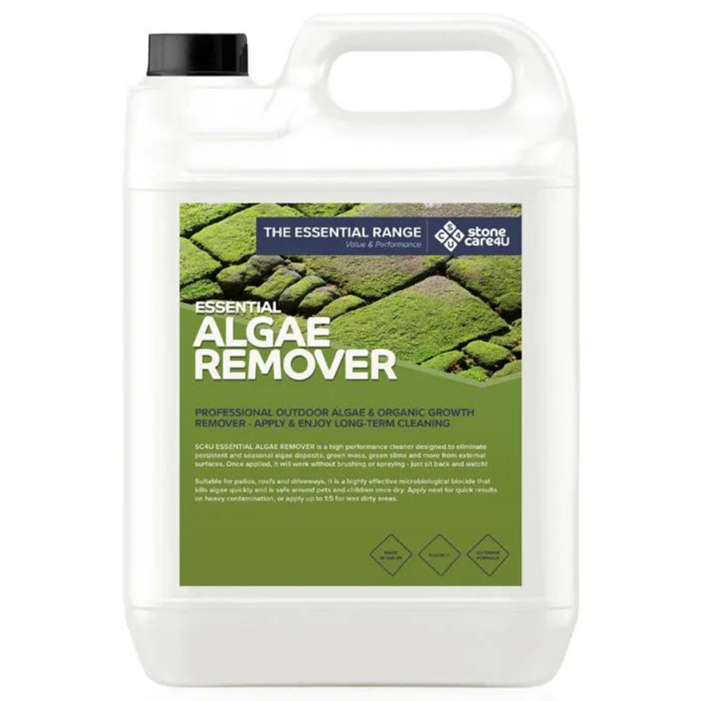 Clear the way for a beautiful day with the StoneCare4U Essential Algae Remover. This is a high-performance cleaner designed to eliminate persistent and seasonal algae deposits, green growth and more from external surfaces. It is highly effective for the removal of algae, green growth, lichen, fungi, mould, bacteria and viruses on external hard surfaces. Safe to use and fully biodegradable, it is suitable for patios, roofs and driveways. Use annually for complete protection, or use it where any algae and green growth appears during the year, around downpipes and drains. You do not need to retreat the whole area. How To Apply: Remove any loose debris from the work area, and ensure you have adequate safety wear, i.e. gloves, suitable protective eyewear, face mask and clothing. Perform a small test application in an inconspicuous area to determine a suitable dilution rate and dwell time. This will indicate the suitability of the product for your surface. For typical applications, the algae remover is to be used neat if the area is heavily contaminated or diluted up to 1:20 with clean water for less dirty areas. Mix well and use at a rate not exceeding 5m² per litre. Apply a flood coat spraying in a sweeping motion across the surface. A second pass may be necessary to ensure complete coverage. Allow to soak in and completely dry on the surface, and do not wash off. Then, you will find that any green growth and algae will disappear within days and not return for up to 12 months when another application will be necessary. Further treatments may be required for very stubborn green growth. These should be dislodged with a hose or sprayer if they cling to roof tiles or similar surfaces. Please Note: Do not apply when the threat of rain is imminent. Always try the product in an inconspicuous area before use. Extra caution is required when applying near or around fish ponds or similar. If you accidentally over-spray onto delicate plant life, rinse with clean water. Coverage: Use undiluted on heavily contaminated areas or up to 1:20 dilution (low contamination) when approximate coverage is 100m² per 5L. Coverage areas will vary depending on surface contamination and method of application. Quantity: 5L.
