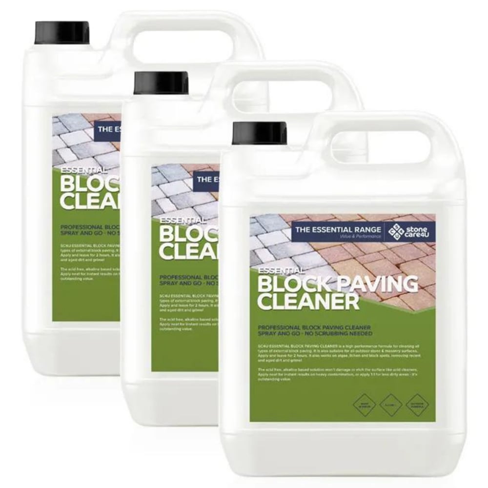 Restore the charm of your outdoor space with the StoneCare4U Essential Block Paving Cleaner. This is a high-performance cleaner for cleaning all types of external block paving. Apply and leave for 2 hours, and it will easily remove dirt and grime without the need for scrubbing. Suitable for all outdoor stone and masonry surfaces, including pavers, pathways, driveways, block paving, patios, and natural and engineered stone. It also works on algae, lichen and black spots, removing recent and aged dirt and grime. The acid-free, alkaline-based solution won’t damage or etch the surface like acid cleaners. How To Apply: Before use, remove any loose debris from the block paving, and ensure you have adequate safety wear, i.e. gloves, suitable protective eyewear, face mask and clothing. The cleaner is to be used neat or diluted 1:1 with clean water – always perform a small test area to determine a suitable dilution rate and dwell time. Carefully transfer the cleaning fluid from the bottle to a pump sprayer or watering can. If these containers are not available, then cleaning fluid can be used directly from the bucket. The cleaner needs to be left on the surface for at least an hour. During that time, the surface must not be allowed to dry out. If necessary, mist with additional cleaning fluid or clean water to prevent the paving from drying. Work the area(s) of staining with a brush, if necessary, but ensure the surface remains wet. After at least two hours of dwell time, the treated area should be washed down with clean water first to neutralise the cleaner before, then power washing off for perfect results. Please note the cleaning fluid can harm or kill vegetation, so try to avoid washing off garden or lawn grass. If this is unavoidable, then rinse with plenty of clean water to dilute the cleaner. In areas of heavy soiling and extremely stubborn black or white lichen spots, it may be necessary to extend the dwell time of the cleaner for up to four hours or overnight, where necessary, before power washing off. To achieve perfect results on aged, stubborn black or white lichen spots, test a small area to ascertain the required dwell time necessary to remove the marks – then follow the instructions above. Two to three applications may be needed. Please Note: The cleaner contains a chlorine-type agent as an active ingredient and will stain fabrics and sensitive materials. Take special care to avoid contact with fabrics and tarmac during application. The fluid might cause slight lightening of some surfaces – always try the product in an inconspicuous area before use. Coverage: Up to 50m² per 5L when diluted 1:1. Coverage will vary depending on surface contamination. Quantity: 5L. Pack of three.