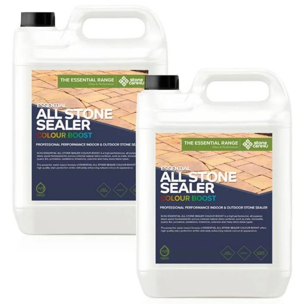 Enhance the stone's natural colour with the StoneCare4U Essential Colour Boost All Stone Sealer 5L 2 Pack. Suitable for all types of patio, paving and pathways. This professional-grade sealant for external natural stone protects against stains and soiling, for example, general dirt and grime. How to apply: Remove any loose debris from the work surface before you start and certainly, ensure you have adequate safety wear, i.e. gloves, suitable protective eyewear, face mask and clothing. Leave the surface for a minimum of 72 hours with clear and dry weather to ensure the surface is completely dry and ready to be sealed; likewise, make sure weather conditions are favourable before commencing. Application temperature range: 15 degrees to 23 degrees Celsius. Firstly, apply the initial coat of stone sealer with a low-pressure sprayer, roller, natural fibre brush or sponge. Above all, do not dilute the product! Importantly, any excess sealer must be completely removed from the surface after 20 to 30 minutes. Apply a second application after 45 to 60 minutes, repeating the process. Above all, it is important that the stone surface is kept completely dry through the curing process, which can take up to 72 hours. Please note: The sealer will alter the colour/appearance of the stone surface. Therefore, we always advise trying the product in an inconspicuous area prior to use. Surfaces that are not to be sealed should be protected with masking material. This product is not suitable for Kandla Grey (mid and light grey) sandstone.