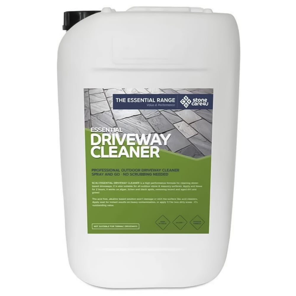 Ensure your driveway remains free of debris by utilising the StoneCare4U Driveway Cleaner 25L. This product is designed for various outdoor stone and masonry surfaces, such as driveways, pavers, pathways, block paving, and patios, as well as natural and engineered stone. It is a powerful cleaner specifically formulated for external natural stone driveways. The solution is effective in removing algae, lichen, and black spots, as well as both recent and aged dirt and grime. Leave it on for 2 hours for optimal results. Unlike acid cleaners, this acid-free, alkaline-based cleaner will not harm or corrode the surface. Please note that it is not recommended for tarmac driveways. How to apply: Before use remove any loose debris from the driveway, and ensure you have adequate safety wear, i.e. gloves, suitable protective eyewear, face mask and clothing. It is to be used neat or diluted 1:1 with clean water – always perform a small test area to determine a suitable dilution rate and dwell time. Carefully transfer the cleaning fluid from the bottle to a pump sprayer or watering can. If these containers are not available then cleaning fluid can be used directly from the bucket. The cleaning fluid needs to be left on the surface for at least an hour, during that time the surface must not be allowed to dry out. If necessary mist with additional cleaning fluid or with clean water to prevent the driveway from drying. Work the area(s) of staining with a brush, if necessary, but ensure the surface remains wet at all times. After at least two hours of dwell time, the treated area should be washed down with clean water first to neutralise the cleaner before then power washing off for perfect results. Please note the cleaning fluid can harm or possibly kill vegetation so try to avoid washing off onto garden or lawn grass. If this is unavoidable then rinse with plenty of clean water to dilute the cleaner. In areas of heavy soiling and extreme, stubborn black and white lichen spots it may be necessary to extend the dwell time of Essential Driveway Cleaner to up to 4 hours or overnight where necessary, before power washing off. To achieve perfect results on aged, stubborn black and white lichen spots, test a small area to ascertain the required dwell time necessary to remove the marks – then follow the instructions above. 2 to 3 applications may be needed. Please note: The cleaner contains a chlorine-type agent as an active ingredient and will stain fabrics and sensitive materials. Take special care to avoid contact with fabrics and tarmac during application. The fluid might cause slight lightening of some surfaces – always try the product in an inconspicuous area before use. Coverage: Up to 50m2 per 5L when diluted 1:1. Coverage varies depending on surface contamination.