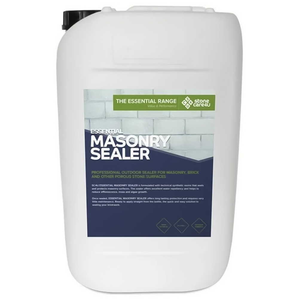 Protect stone surfaces from damage with the StoneCare4U Essential Masonry Sealer 25L - specifically designed for outdoor use on masonry, brick, and porous vertical stone surfaces. It contains resins that effectively seal and protect these surfaces, providing excellent water repellence and helping to prevent efflorescence, green growth, and algae growth. This sealer offers long-lasting protection and requires minimal maintenance once applied. It is a convenient and efficient solution for sealing masonry, blockwork, and brickwork, and it can be applied directly from the bottle. To apply the sealer, it is important to prepare the work surface by removing any loose debris. Additionally, ensure that you have the necessary safety wear, including gloves, suitable protective eyewear, an FFP3 class mask, and appropriate clothing. The application temperature should not be lower than 8 degrees Celsius. Before using the sealer, it is recommended to perform a small test application in an inconspicuous area to determine its suitability and effectiveness for your specific surface. How to apply: Before applying the sealer, make sure that the surface is completely clean and dry. You can use a low-pressure sprayer, roller, natural fibre brush, or sponge to apply the product. Apply the first coat generously, ensuring that the sealer penetrates the surface as much as possible. Once the first coat is applied, proceed to apply a second coat before the first coat has dried to ensure complete coverage. It is important not to dilute the sealer. The surface should be dry within 45 to 60 minutes after application. It is crucial to note that if rain is forecasted or starts during the application process, you should immediately stop the treatment and cover the freshly impregnated areas. The surface needs to remain completely dry for the first 6 hours after application. Please be aware that the sealer may subtly enhance the natural colour of the stone surface. Therefore, it is always recommended to test the product in an inconspicuous area before applying it to the entire surface. Additionally, any surfaces that are not intended to be sealed should be protected with masking material.