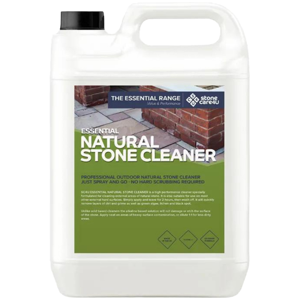 Clean external areas of natural stone effortlessly with StoneCare4U Essential Natural Stone Cleaner. It is also suitable for use on most other external hard surfaces. Simply apply and leave for two hours, then wash off. It will quickly remove layers of dirt and grime and green algae, lichen and black spots. How To Apply: Before use, remove any loose debris from the area and ensure adequate safety wear, i.e. gloves, suitable protective eyewear, face mask and clothing. The cleaner is to be used neat or diluted 1:1 with clean water – always perform a small test area to determine a suitable dilution rate and dwell time. Carefully transfer the cleaning fluid from the bottle to a pump sprayer or watering can. If these containers are unavailable, cleaning fluid can be used directly from the bucket. The cleaning fluid needs to be left on the surface for at least an hour. During that time, the surface must not be allowed to dry out. If necessary, mist with additional cleaning fluid or clean water to prevent the surface from drying. Work the area(s) of staining with a brush, if necessary, but ensure the surface remains wet at all times. Leave for at least two hours, and after at least two hours of dwell time, the treated area should be washed down with clean water first to neutralise the cleaner before, then power washing off for perfect results. Please note the cleaning fluid can harm or possibly kill vegetation, so try to avoid washing off garden or lawn grass. If this is unavoidable, then rinse with plenty of clean water to dilute the cleaner. In areas of heavy soiling and extreme, stubborn black or white lichen spots, it may be necessary to extend the dwell time to up to four hours or overnight, where necessary, before power washing off. To achieve perfect results on very aged, stubborn black or white lichen spots, test a small area to ascertain the required dwell time necessary to remove the marks – then follow the instructions above. Two to three applications may be needed. Please Note: It contains a chlorine-type agent as an active ingredient and will stain fabrics and sensitive materials. Take special care to avoid contact with fabrics and tarmac during application. The fluid might cause slight lightening of some surfaces – always try the product on-site in an inconspicuous area before use. Coverage: Up to 50m² per 5L when diluted 1:1. Coverage varies depending on surface contamination. Quantity: 5L.