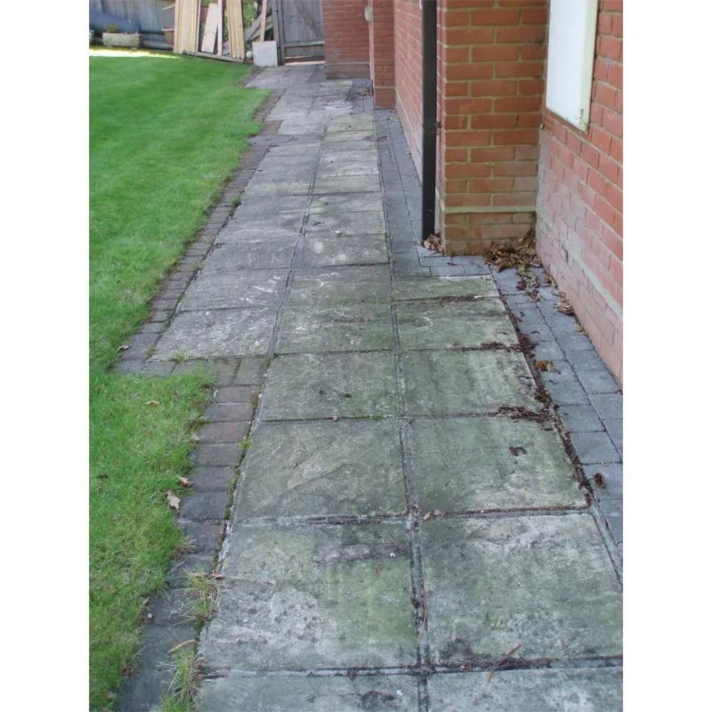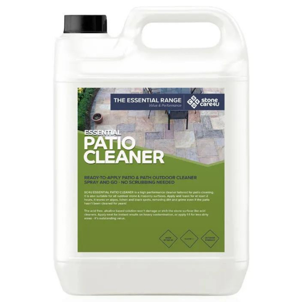 Clean and restore your patio with the StoneCare4U Essential Patio Cleaner, a ready-to-use cleaner tailored for patio cleaning. Suitable for all outdoor stone and masonry surfaces, it also works on algae, lichen and black spots, removing dirt and grime even if the patio hasn’t been cleaned for years. The acid-free, alkaline-based solution won’t damage or etch the stone surface like acid cleaners. It contains a biocide that helps to eliminate organic matter between slabs and grout, such as weeds, green growth and leaf mulch, within just two hours. How To Apply: Before use, remove any loose debris from the work surface and ensure you have adequate safety wear, i.e. gloves, suitable protective eyewear, face mask and clothing. Note: Following the instructions below, perform a small test application in an inconspicuous area before use. This will indicate the suitability and effectiveness of the product for your surface. If unsuitable for your requirements, do not proceed. The cleaner is to be used neat or diluted 1:1 with clean water. Carefully transfer the cleaning fluid from the bottle to a pump sprayer or watering can. If these containers are not available, then cleaning fluid can be used directly from the bucket. Apply generously and leave to work for at least two hours. The cleaning fluid needs to be left on the surface for at least two hours. During that time, the surface must not be allowed to dry out. If necessary, mist with additional cleaning fluid or with a fine mist of clean water to prevent the paving from drying. Work the area(s) of stubborn staining with a brush, if necessary, but ensure the surface remains wet at all times. After at least two hours of dwell time, the treated area should be washed down with clean water first to neutralise the cleaner before, then power washing off for great results. Please note the cleaning fluid can harm or possibly kill vegetation, so try to avoid washing off garden or lawn grass. If this is unavoidable, then rinse with plenty of clean water to dilute the cleaner. In areas of heavy soiling and extreme, stubborn black or white lichen spots, it may be necessary to extend the dwell time of the cleaner to up to four hours or overnight, where necessary, before power washing off. To achieve perfect results on aged, stubborn black or white lichen spots, test a small area to ascertain the required dwell time necessary to remove the marks – then follow the instructions above. Two to three applications may be needed. Please Note: The cleaner contains a chlorine-type agent as an active ingredient and will stain fabrics and sensitive materials. Take special care to avoid contact with fabrics and tarmac during application. The fluid might cause slight lightening of some surfaces – always try the product in an inconspicuous area before use. Coverage: Up to 25m² per 5L container. Coverage varies depending on surface contamination. Quantity: 5L.