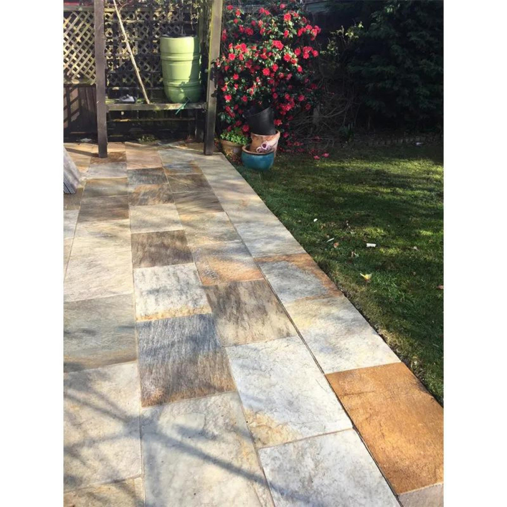 Elevate the charm of your outdoor oasis with the StoneCare4U Essential Patio Perfect, a high-performance patio and path outdoor cleaner. Within just two hours and without any scrubbing, it will eliminate layers of grime, dirt and lichen from your stone. With a bit of brushing and a pressure spray, your patio will be as good as new. It also contains a biocide that helps to eliminate organic matter between slabs and grout, such as weeds, green growth and leaf mulch. It is an alkaline-based solution for a less aggressive impact and works without harmful acids that can etch and damage the natural stone surface. How To Apply: Before use, remove any loose debris from the patio area, and ensure you have adequate safety wear, i.e. gloves, suitable protective eyewear and clothing. Mix a solution of the cleaner 1:1 with clean water, taking care not to spill the cleaner on sensitive surfaces, i.e. fabrics. Carefully transfer the cleaning fluid from the bottle to a pump sprayer or watering can. If these containers are not available, then cleaning fluid can be used directly from the bucket. The cleaning fluid needs to be left on the surface for at least an hour. During that time, the surface must not be allowed to dry out. If necessary, mist with additional cleaning fluid or clean water to prevent the paving from drying. Work the area(s) of staining with a brush, if necessary, but ensure the surface remains wet at all times. After at least one hour of dwell time, the treated area should be washed down with clean water first to neutralise the cleaner before, then power washing off for perfect results. Please note the cleaning fluid can harm or possibly kill vegetation, so try to avoid washing off garden or lawn grass. If this is unavoidable, then rinse with plenty of clean water to dilute the cleaner. In areas of heavy soiling and extreme, stubborn black or white lichen spots, it may be necessary to extend the dwell time to up to four hours or overnight, where necessary, before power washing clean to achieve perfect results. Where isolated areas of black or white lichen spots remain, apply a second, undiluted coat and leave it to dwell for an extended period to dissolve the spots – clean away as before. Coverage: Up to 50m² per 5L when diluted 1:1. Coverage varies depending on surface contamination. Quantity: 5L. Pack of three.