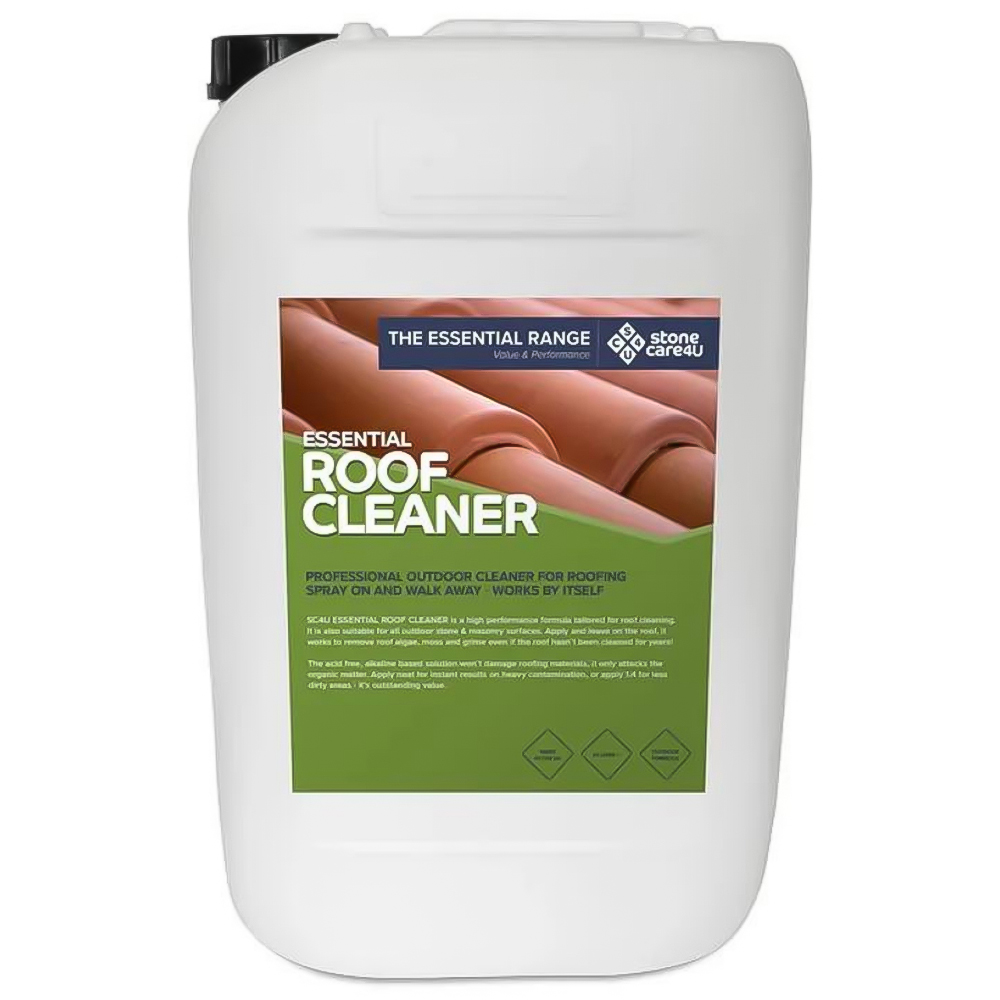 Extend the life of your roof with the StoneCare4U Essential Roof Cleaner, an alkaline-based solution for a less aggressive impact. Without mechanical agitation, it eliminates grime, green growth, algae and lichen from your roofing. This roof cleaner is acid-free, unlike other products that work on the roofing with lots of power or pro formulas with corrosive acids that can etch and damage the concrete or natural stone surface. How To Apply: Remove any loose debris from the work area, and ensure you have adequate safety wear, i.e. gloves, suitable protective eyewear, face mask and clothing. It is to be used neat or diluted up to 1:4 with clean water – always perform a small test area to determine a suitable dilution rate and dwell time. Carefully transfer the cleaning fluid from the bottle to a sprayer or watering can. If these containers are not available, then cleaning fluid can be used directly from the bucket. The cleaning fluid needs to be left on the surface for at least one hour. During that time, the surface must not be allowed to dry out. If necessary, mist with additional cleaning fluid or clean water to prevent the roof from drying. After at least one hour of dwell time, the treated area can be washed down with clean water first to neutralise the cleaner, then power washing off for perfect results. Please Note: The cleaning fluid can harm or possibly kill vegetation, so try to avoid washing off garden or lawn grass. If this is unavoidable, then rinse with plenty of clean water to dilute the cleaner. For badly contaminated surfaces with heavy green growth and algae deposits, it is recommended that you apply neat, leave it to work, and then pressure wash it off. In areas of light soiling, it is best to apply a 1:4 mix of roof cleaner and fresh water. Leave it to dwell for up to four hours, then wash off as before. To achieve perfect results on aged, stubborn black or white lichen spots, test a small area to ascertain the exact dwell time necessary to remove the lichen or green growth or marks – then follow the instructions above. In that case, two or three applications may be needed. Coverage: Up to 50m² per 5L when diluted 1:1. Coverage areas will vary depending on surface contamination. Quantity: 25L.