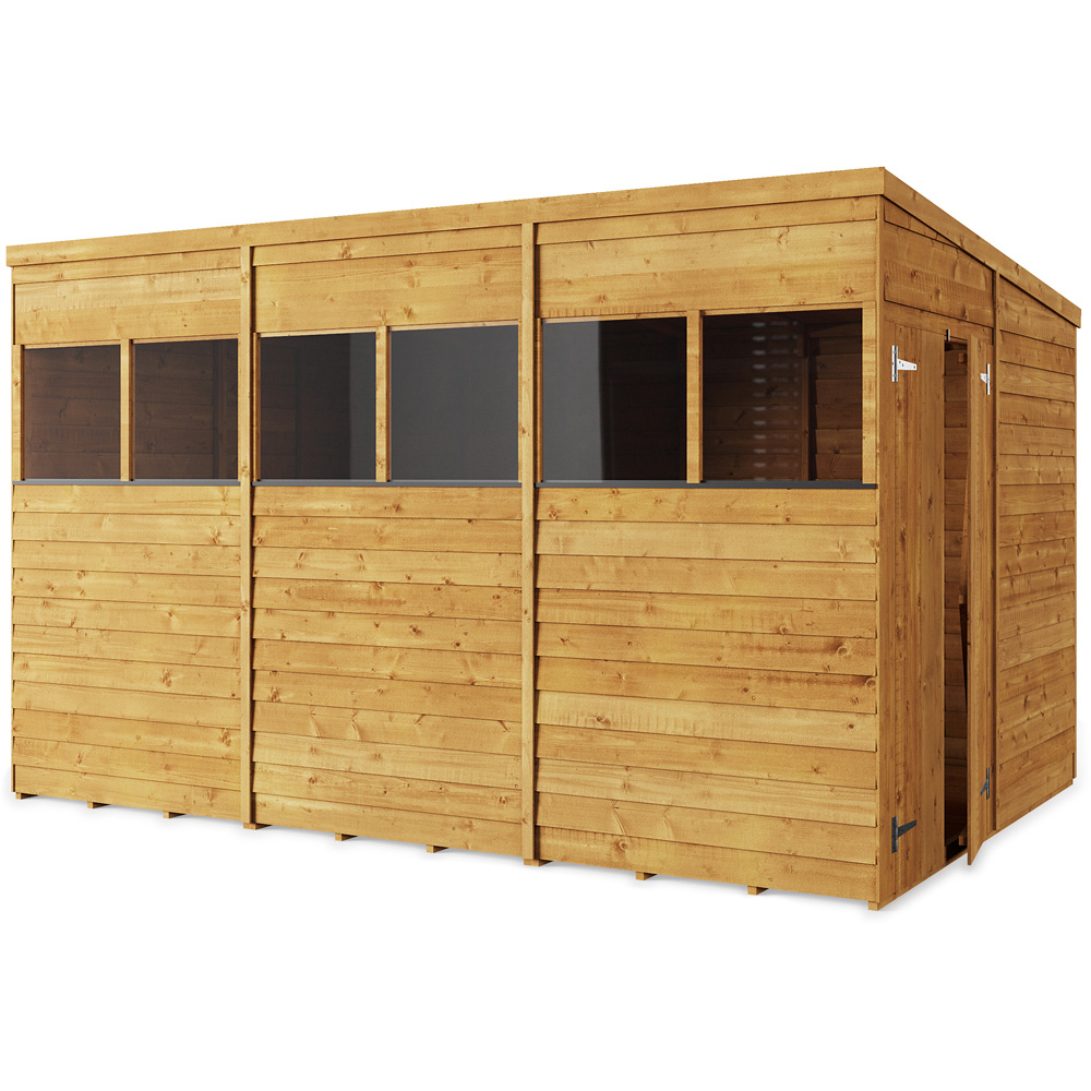 Maximise your outdoor space with this StoreMore Double Door Overlap Pent Shed with Window. Designed to be fully customisable, this shed adapts to most garden spaces and gives you control over where to place its doors and windows. Pressure-treated for sturdiness, this shed offers longevity and extra protection. Easy to access, the wide double doors make using the shed or moving around items hassle-free. Also, it comes complete with a floor, roof and felt. Size: 12 x 8ft.