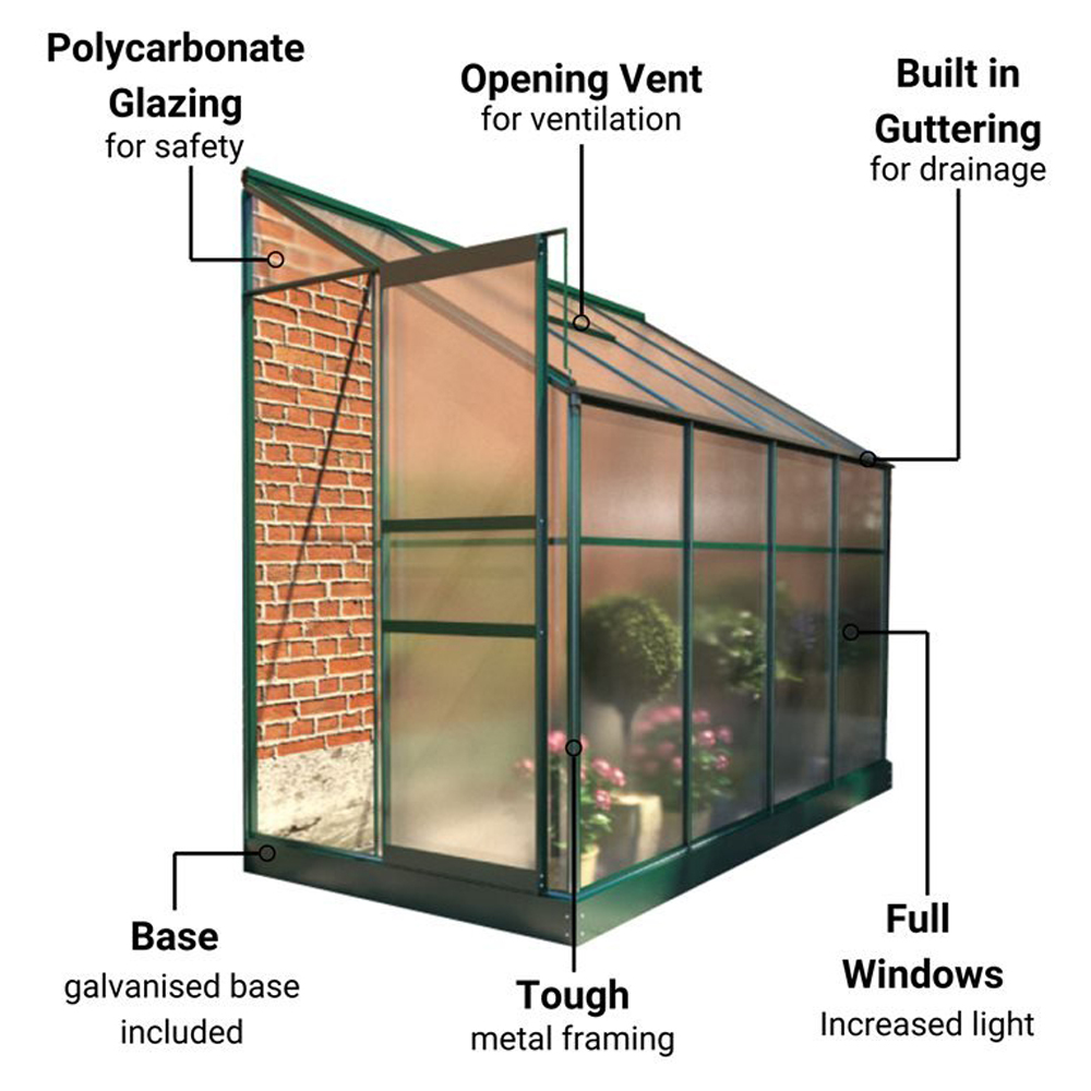 Take care of your delicate plants with the StoreMore Aluminium Frame Greenhouse. It is ideal for beginners and experienced gardeners who passionately nurture their plants. This greenhouse features a single sliding door allowing you to easily tend to your plants. The tough and rust-proof aluminium frame and galvanised base provide exceptional durability and structural integrity. The opening roof vent promotes optimal airflow, while the water gutter system efficiently manages drainage inside the greenhouse. The twin-wall polycarbonate glazing diffuses sunlight protecting your plants from excessive heat and ensuring they receive the right light. This glazing made of polycarbonate materials enhances the structural durability and safety of the greenhouse. This greenhouse is designed to provide hassle-free gardening solutions that require minimal maintenance. Dimensions: 4 x 8ft.