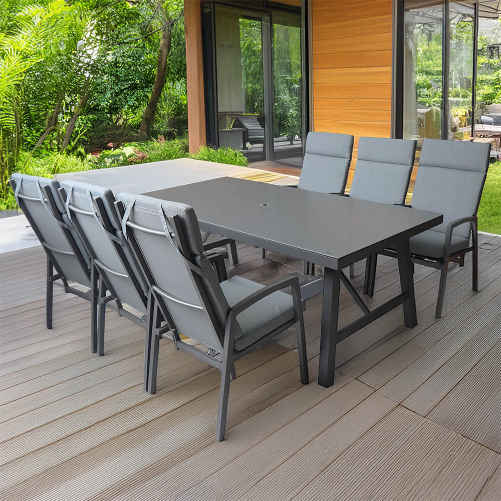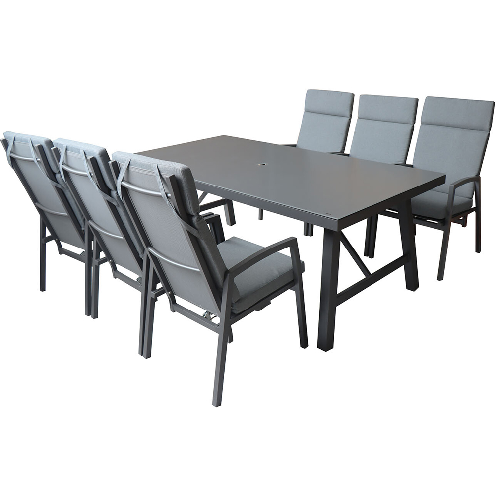 The Stowbridge 7 Piece Piston Dining Set is the ideal choice for family gatherings, BBQs, or outdoor dining in style. Featuring a durable aluminium frame with a powder-coated finish, this set is rust-resistant and built to last. Designed for up to six people, it's perfect for everyday meals or special occasions. The tempered glass tabletop offers high strength and enhanced longevity. The chairs are equipped with adjustable air cylinders, allowing you to customise your comfort to suit your preferences. They can serve as dining chairs or recline for a more relaxed seating option. Sturdy and built to endure, this dining set creates a stunning focal point that will undoubtedly impress your guests.