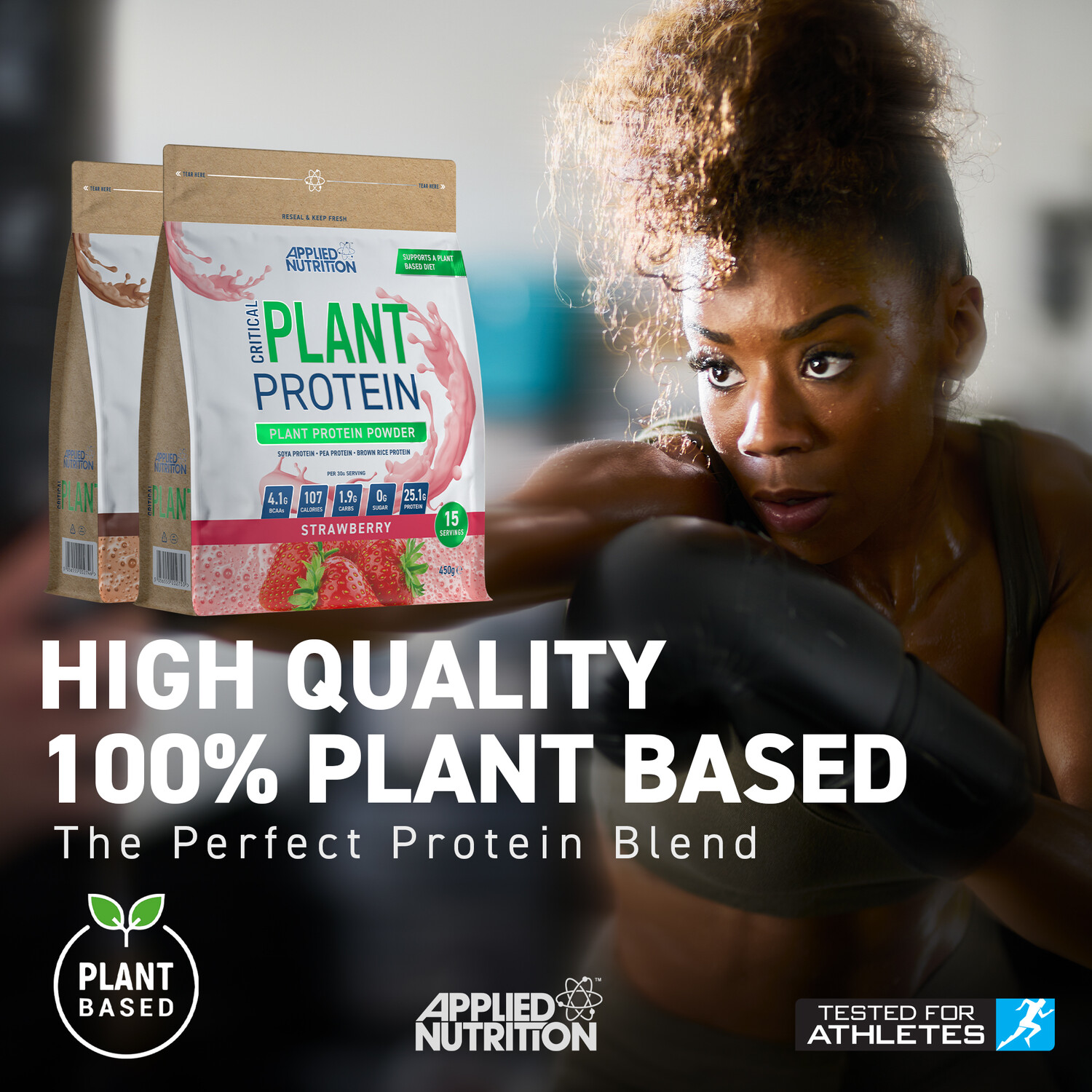 This Strawberry Critical Plant Protein Powder combines soya protein, pea protein, and brown rice protein for those with a plant-based diet. It has 25g of protein per serving to facilitate the growth of muscles and is suitable for vegans and vegetarians. It has a tasty strawberry flavour, is low in fat and sugar, and is halal certified.