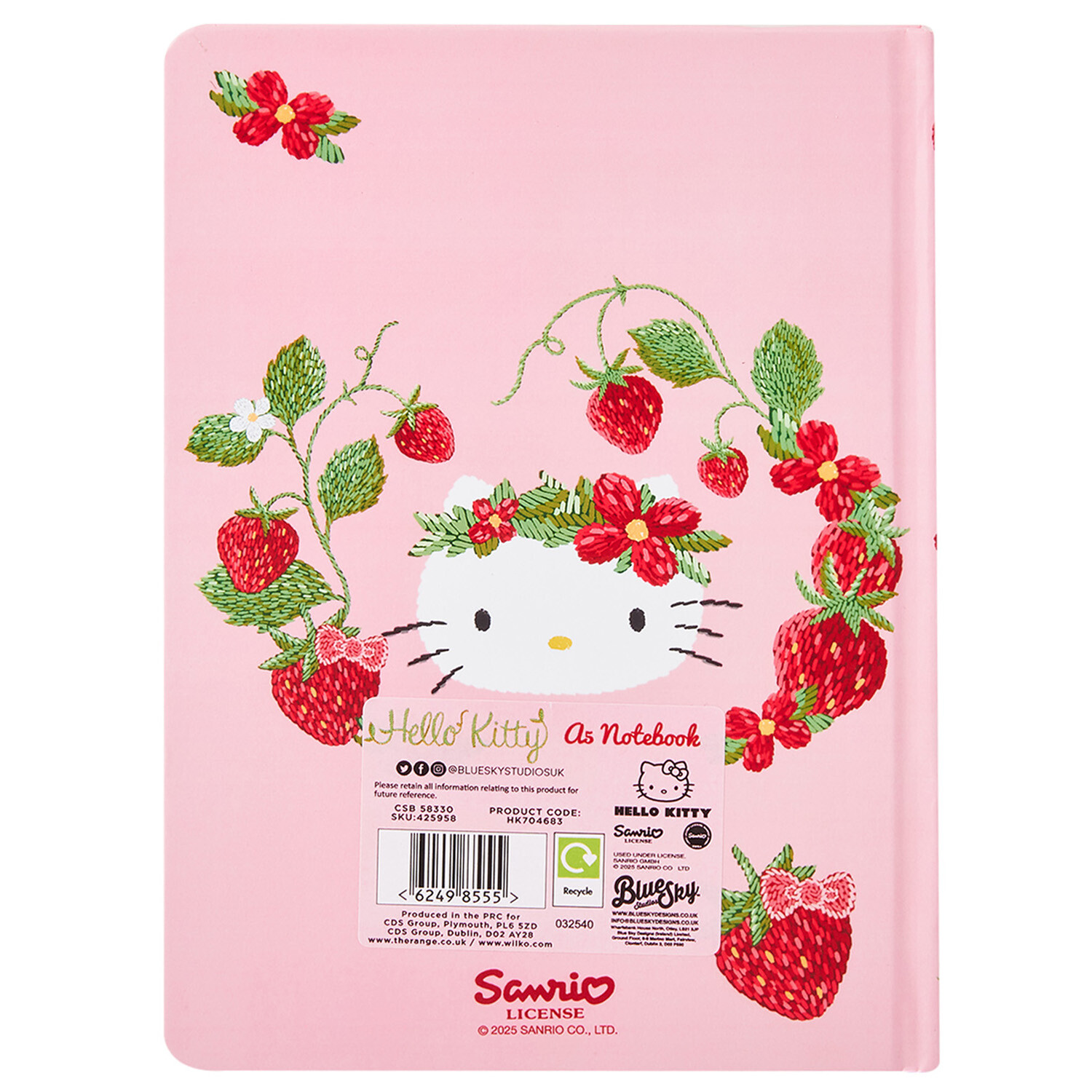 Take notes or doodle in the Strawberry Hello Kitty Pink A5 Notebook. Featuring a charming pink cover adorned with strawberries, floral accents and Hello Kitty herself, this notebook makes writing a joyful experience. Perfectly sized for bags and desks, it includes lined pages for neat writing.