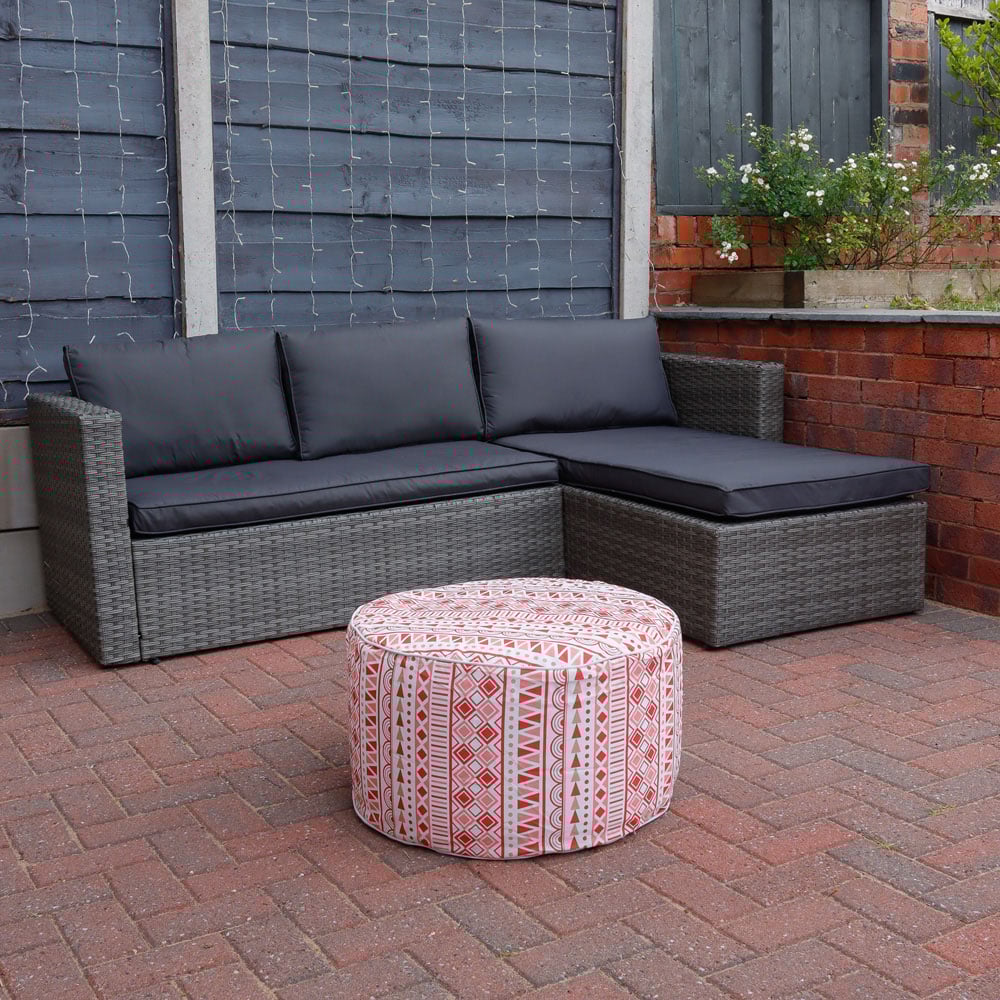Make a classy addition to your outdoor space with this Streetwize Red Morocco Outdoor Pouf Ottoman. Made from durable polyester, this inflatable ottoman features a Moroccan printed design, which will allow you to rest and unwind in the garden. It is ideal for resting your feet up and serving as extra seating when you have a lot of guests. This ottoman cushion is perfect for various outdoor settings, including tiny gardens, terraces, balconies, and extensive open-plan landscaped gardens. It has a distinctive printed design that will brighten up your outdoor area and an inflatable cushion inside can be deflated and stored away when not in use. Dimensions: H30cm x D60cm.