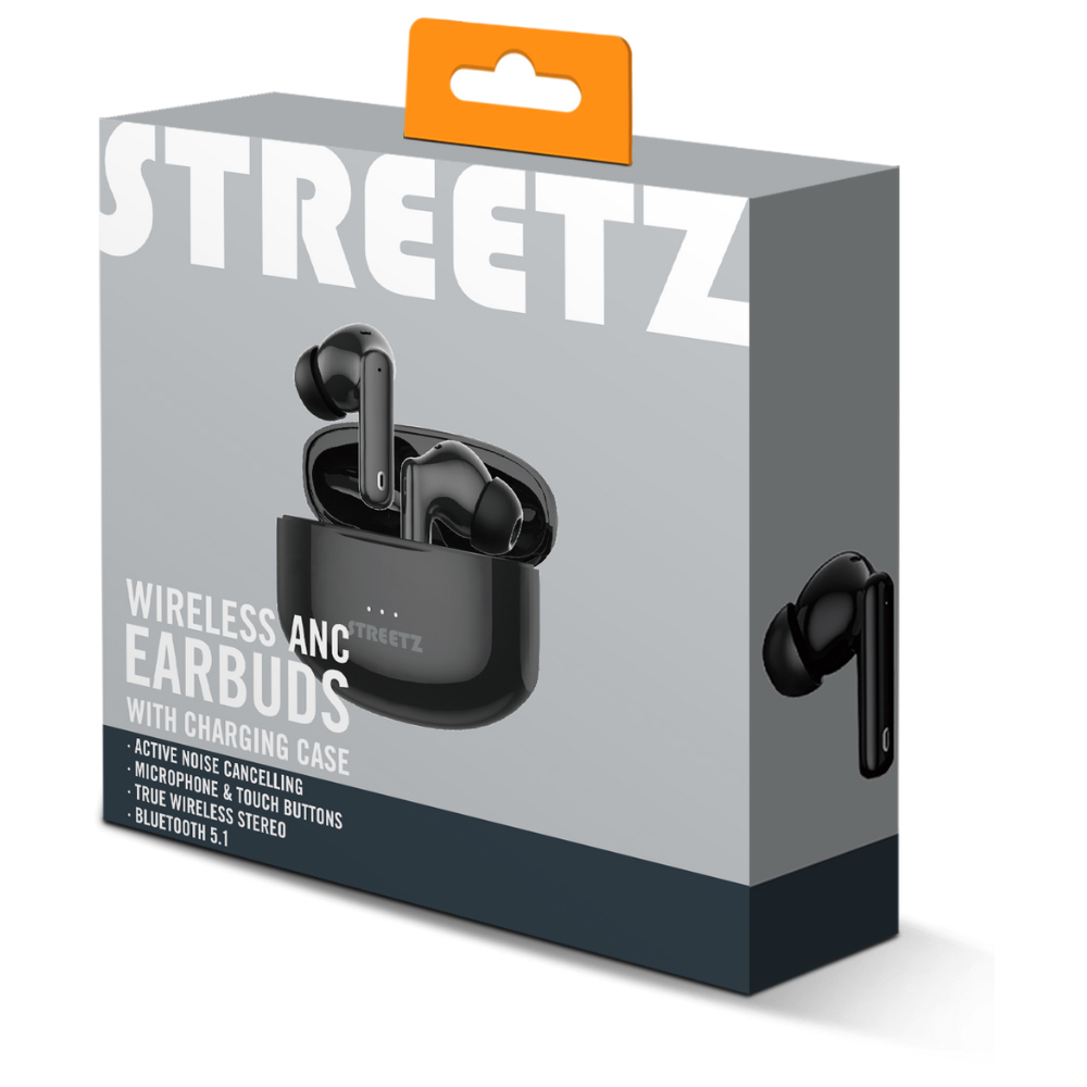 Enjoy your favourite music with the Streetz Black Active Noise Cancelling Ear Buds. These earbuds have a noise cancellation feature which enables you to effortlessly immerse in the music without the disturbance of all external sounds. This pack includes three different ear tip sizes to provide the most secure and comfortable fit for your ears. The surrounding noise is reduced to help you focus on what you want to hear with the unique earbud design. These earbuds feature a range of up to 10m, making them convenient and hassle-free while listening to your favourite tunes. The 13mm drivers and 32 Ω impendence create a rich and powerful audio experience with superb audio clarity. You can make your chill time more comfortable with the press of a button to block out the noise and listen to your favourite songs. You can enjoy this comfort for up to twenty four hours with the compact charging case. Simply put your earbuds back into the case, and they will be fully charged again in one hour. The charging case is charged using the included USB-C cable.