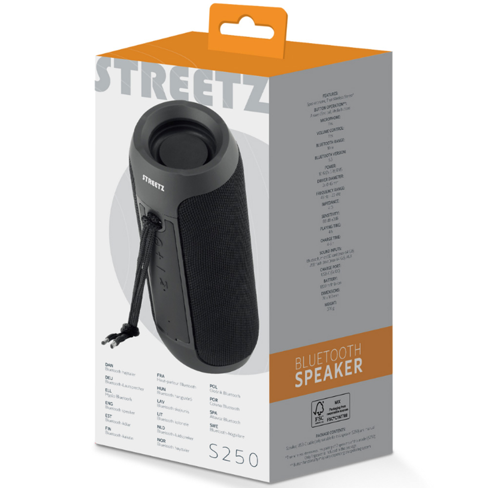 Get ready to take your sound game up a notch with the Streetz Black Bluetooth Wireless Speaker. This speaker provides uninterrupted music for up to four hours, ensuring a worry-free experience. It features a USB Type-C port for fast charging and a charge-and-play function for minimal downtime. With Bluetooth 5 connectivity up to 10 meters, it offers a seamless, wireless experience. Equipped with a 3.5mm audio input, a microSD card slot, and a USB flash memory slot, this speaker delivers 10W (2x 5W) RMS power output for clear and powerful audio reproduction. The True Wireless Stereo feature allows the wireless connection of two speakers, creating a wider soundstage. With a built-in speakerphone, hands-free calls are convenient, and the compact, lightweight design makes it a perfect audio companion on the go. Audio input options include AUX, micro SD card (max 64GB, not included), USB Flash memory (max 64GB, not included), and Bluetooth.