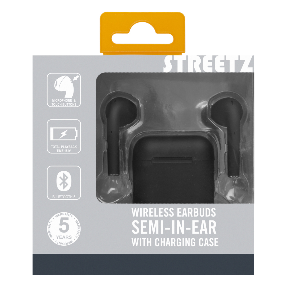 Experience soothing sound quality with the Streetz Black True Wireless Ear Buds. If you're going out for a run or walking through town, these earbuds will be your perfect companions. The fit is suitable for most ears and the open design of the earbuds lets you hear what happens around you. Once paired to your device, just take out the earbuds from the case and they will start and automatically connect to your device. Placing them in the charging case will automatically switch them off and charging will commence. The supplied charging case provides your earbuds with more than four full charges to keep you powered up. Just tap the answer button and continue your task with ease while you communicate, and tap the button again to hang up. These earbuds work excellently well for music, with crisp sound and sensor buttons that allow you to play or pause a track with one tap. You can also go to the next track or skip to the previous one by tapping the side of the earbud. These earbuds have a standby time of 200 hours with a charging time of up to 35 minutes. It features call and media management buttons with Bluetooth 5 function and a frequency range of 20Hz to 20kHz. You can talk or listen to music with one earbud for approximately four hours.