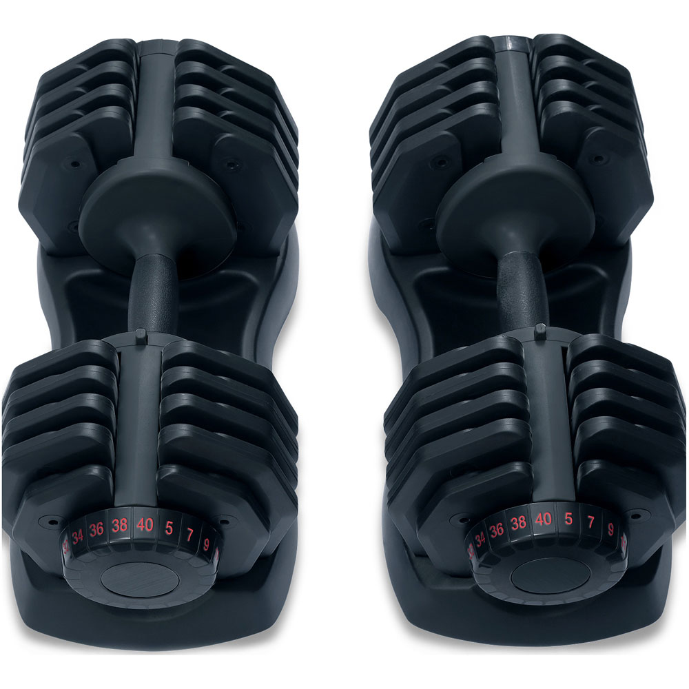 Save Space and Money Save space and save money with several different weight settings on each dumbbell. No need to purchase an entire set of dumbbells anymore, and no need to worry about where to store all of your weights. The Strongology adjustable dumbbell takes care of that. Easy Change of Weight Versatile in design, simply select the weight you want with a simple turn of a dial for a quick and easy weight changes. Each dumbbell adjusts from just 2.5kg to 40kg. Target all Muscles Ideal for a series of exercises, with weights to target all muscles group workouts, ranging from small muscle workouts like Rotator Cuff Rotations, to compound exercises like Squats and Deadlift. Safe and Secure Engineering For ultimate safety and stability, the dumbbell chassis and plate lock together securely with a robustly engineered plate-locking mechanism, rotatable only once the dumbbell is returned to its dock. Quality Design Built to Last The contoured soft grip non-slip handle provides comfortable and secure grip control. Made from heavy-duty laser cut silicone steel that does not rust or fade. Strong moulding encapsulate the durable plates to provide a smooth lift off and quieter workouts.