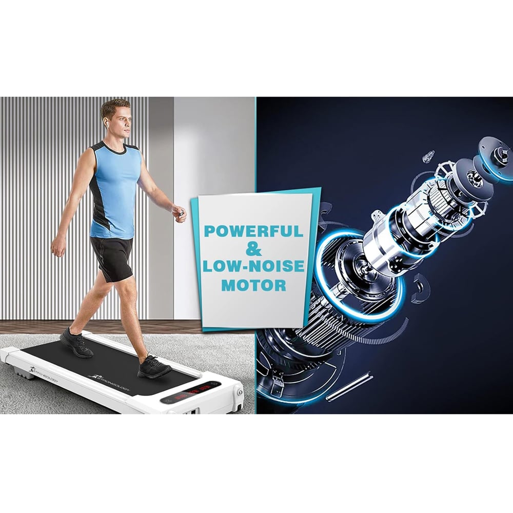 This lightweight portable and slim-line treadmill is the perfect addition to any home or office. Its versatility allows you to use it almost anywhere, from your sitting room in front of the TV to your desk at work. With practicality in mind, this treadmill has been designed with a shorted and lowered deck, complete with two transportation wheels. This slim line design allows easy storage and it can be neatly hidden away under your furniture or upright in a cupboard when not in use. The durable 2.5HP motor provides speeds ranging from 0.8 to 8 km/h suitable for all types of cardiovascular training, whether it be LISS (Low Intense Steady State) or HIIT (High Intensity Interval Training). The treadmill comes complete with a large LED display with a blue-black light displaying your time, speed, calories, distance and step data. The low-noise motor and belt ensure you can exercise quietly, with peace of mind that you are not disturbing other household members or colleagues. Easy to use and maintenance-free, the treadmill has been optimised for both walking and running with 12 different programs. The maximum user weight is 110kg, with dimensions of: Length-128.5 cm, Width-55.5cm, and Height-14.0cm. For your convenience, the treadmill comes complete with a remote control.