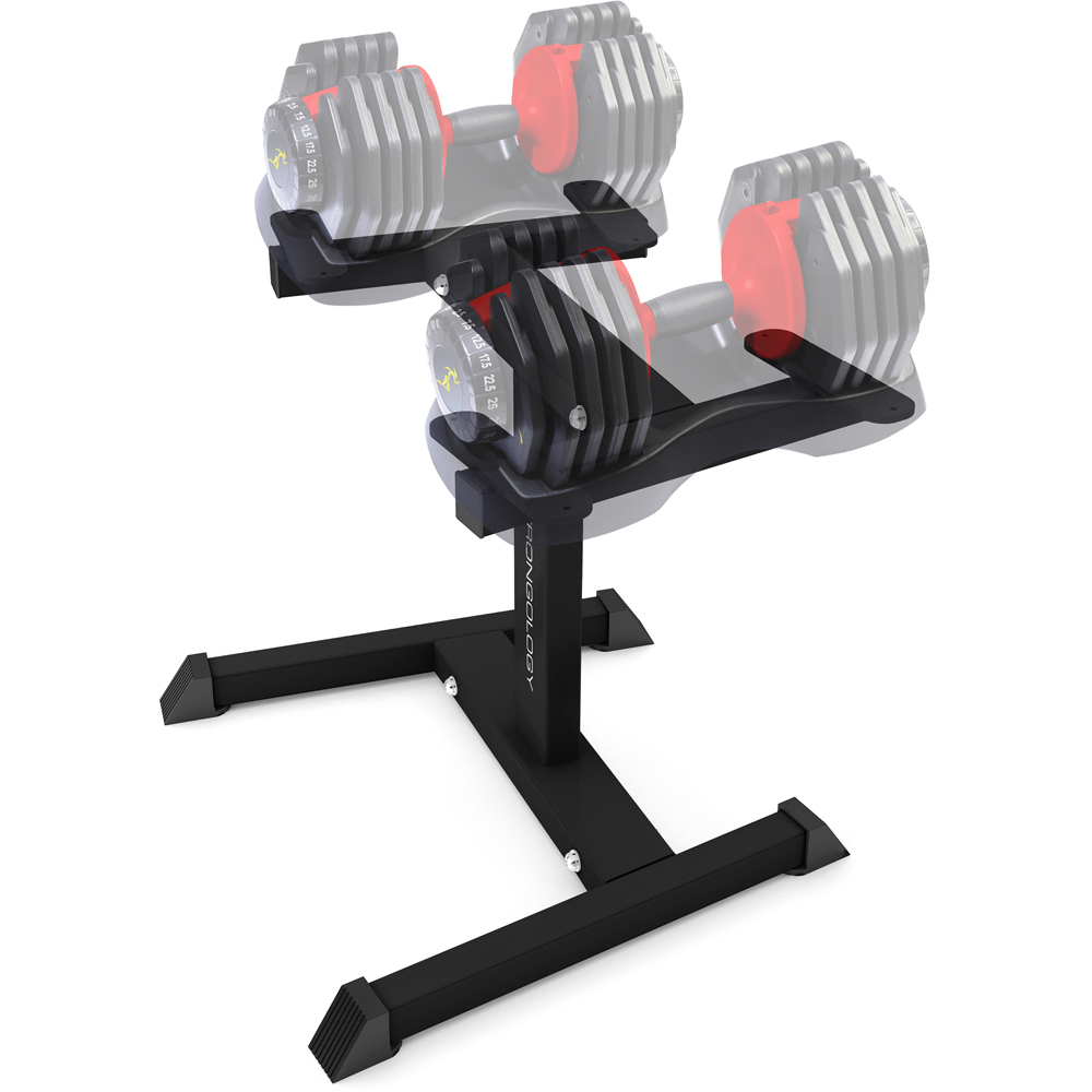 The Strongology Adjustable Dumbbell Stand has been specifically designed to hold a large amount of weight. Stable and safe, with an ergonomic yet robust design, the Strongology Adjustable Dumbbell Floor Stand is made from heavy-duty steel finished in matte black and it is ideal if you have limited floor space. Engineered to hold the dumbbells at a convenient height for the user and at an optimum angle for lifting, the Strongology Adjustable Dumbbell Stand provides safer workouts eliminating the need to bend and pick up weights from the floor. The adjustable dumbbells are positioned shoulder width apart at an optimum level for a comfortable lift, ensuring you don't strain your lower back muscles when picking them up, putting them down or selecting the weights. Dimensions: Length - 69.5cm x Width - 56cm x Height - 49cm. DUMBBELLS NOT INCLUDED.
