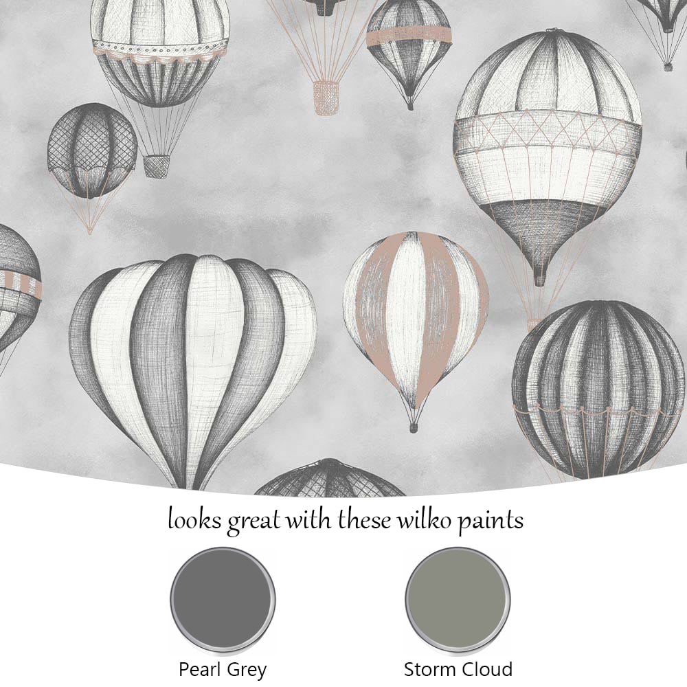 Bring a summer's day feel to your walls with this Sublime Balloon Fiesta Graphite Wallpaper. Featuring pencil-drawn hot air balloons with metallic detailing floating through the clouds - this wallpaper makes for a wonderful feature piece for any home. Room Suitability: Bedroom, Living Room. Application: Paste the Paper, Design Match: Offset. Design Repeat: 53cm, Roll Length: 10m, Width: 52cm.