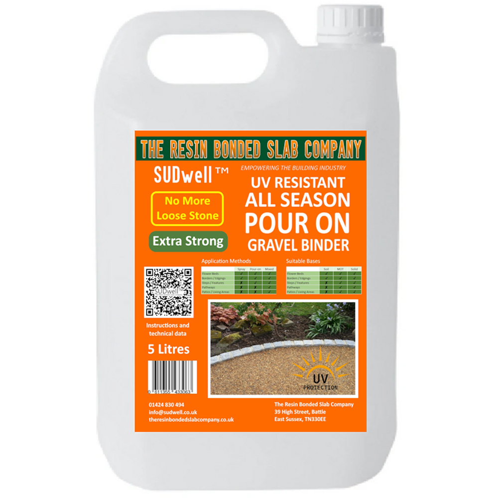 This Sudwell Pour On Gravel Binder 5L is a robust and user-friendly resin designed to secure loose gravel, forming a stable and low-maintenance surface. Ideal for driveways, pathways, and garden areas, this binder enhances durability while preserving a natural appearance. Simply pour the resin over your gravel and let it set to achieve a long-lasting, permeable finish that withstands all seasons.