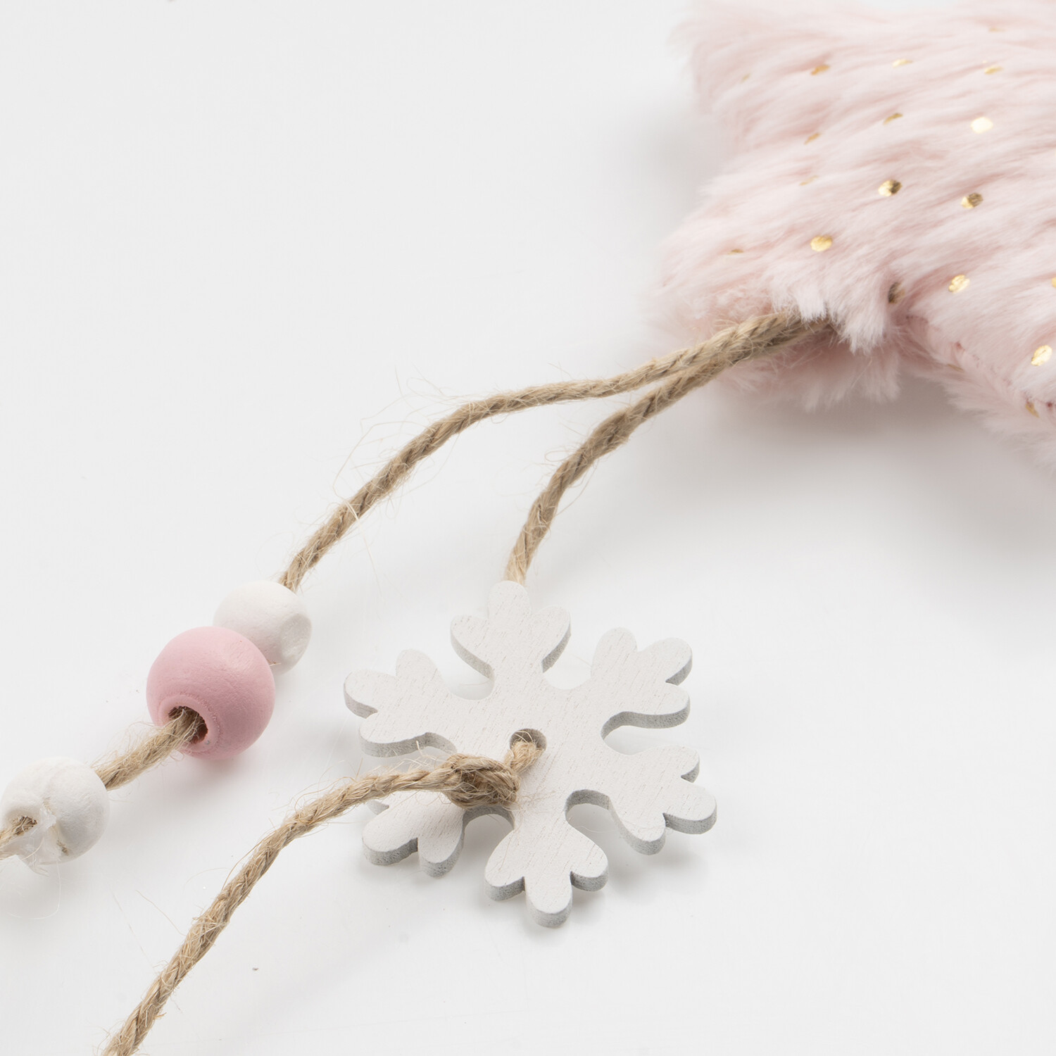 Bring a real girly and glamorous twist to your festive decor and hang the Blush Star Garland amongst your more traditional reds and greens. This chic garland features super fluffy stars in a light blush pink, complemented by gold charms, jute string, and white snowflakes. Effortlessly combining ritzy style and classic festivity, the Blush Star Garland will a fun addition for any home.