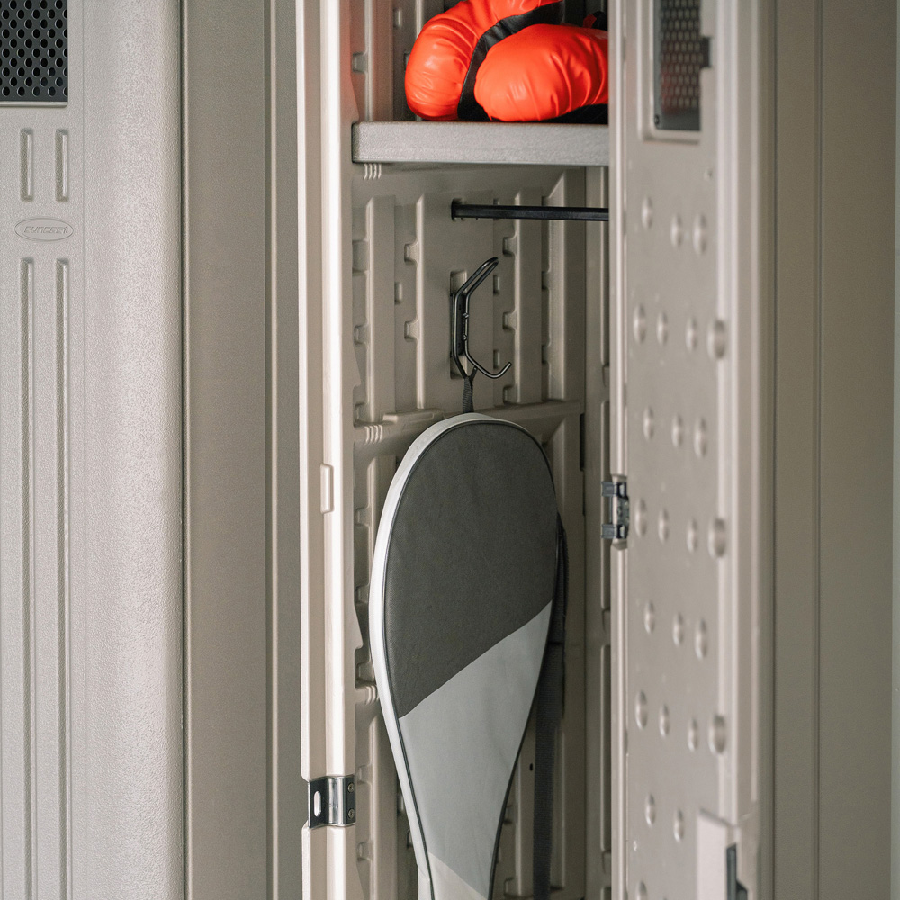 Keep your space organised with the Haven Tall Storage Locker by Suncast. It shatters the notion that garage organisation needs to be metal to be strong and stable. The multi-wall, resin panels are engineered for added strength and durability, making it resistant to dents, rust, and rotting. Equipped with a functional vent for air circulation, two adjustable shelves, one hanging rod, and one coat hook, this locker is the perfect solution for storing sporting equipment, outdoor accessories and more. With a pad-lockable door (lock not included), this locker is sure to keep your items safe and secure. This low maintenance, easy to clean locker provides a storage solution that combines style and function to keep your garage organised and tidy. Internal dimensions: H1750 x W300 x D430mm. Door opening: H1750 x W300mm.