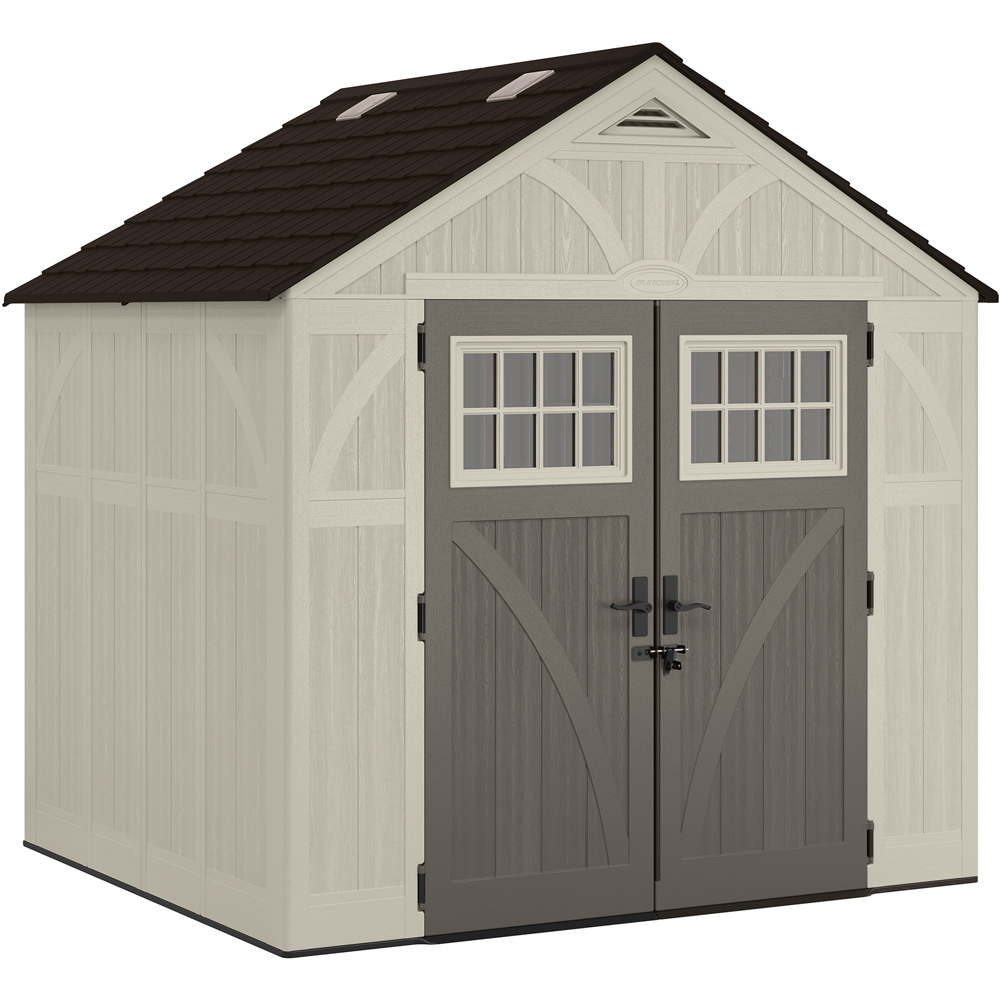 With 11m3 of storage capacity, the Tremont 8 x 7ft. Storage Shed by Suncast has ample space for storing all of your lawn and outdoor equipment. The reinforced resin floor is built to withstand heavy loads, including tractors, mowers and other outdoor equipment. In addition, utilise every inch of space with the included standard corner shelves. Four skylights, along with a door with large windows, provide natural light while you work. Sturdy double doors allow you to access your items easily and are equipped with padlockable doors for added security (lock not included). Constructed of metal-reinforced, multi-wall resin panels, this sturdy shed is weather-resistant and easy to maintain from season to season. Internal dimensions: H2550 x W2360 x D2060mm. Door Opening: H1830 x W1520mm.