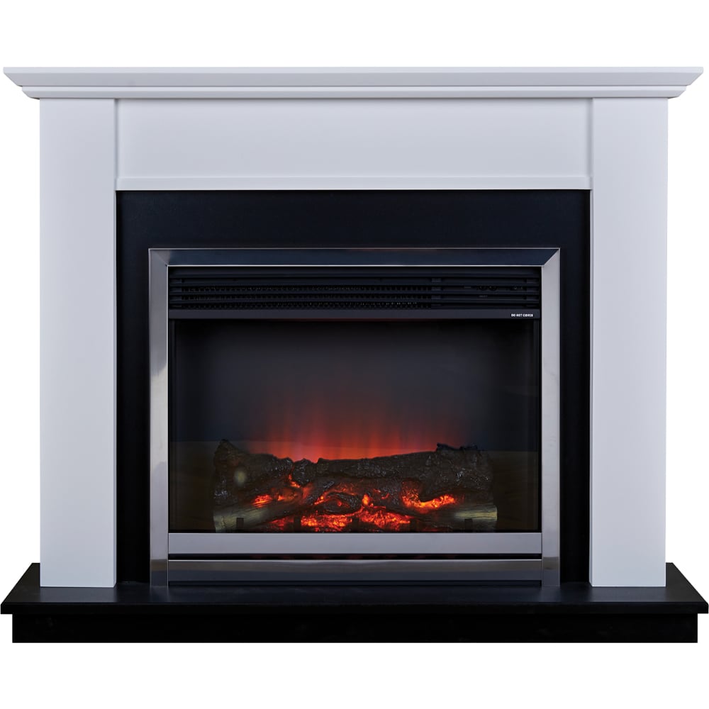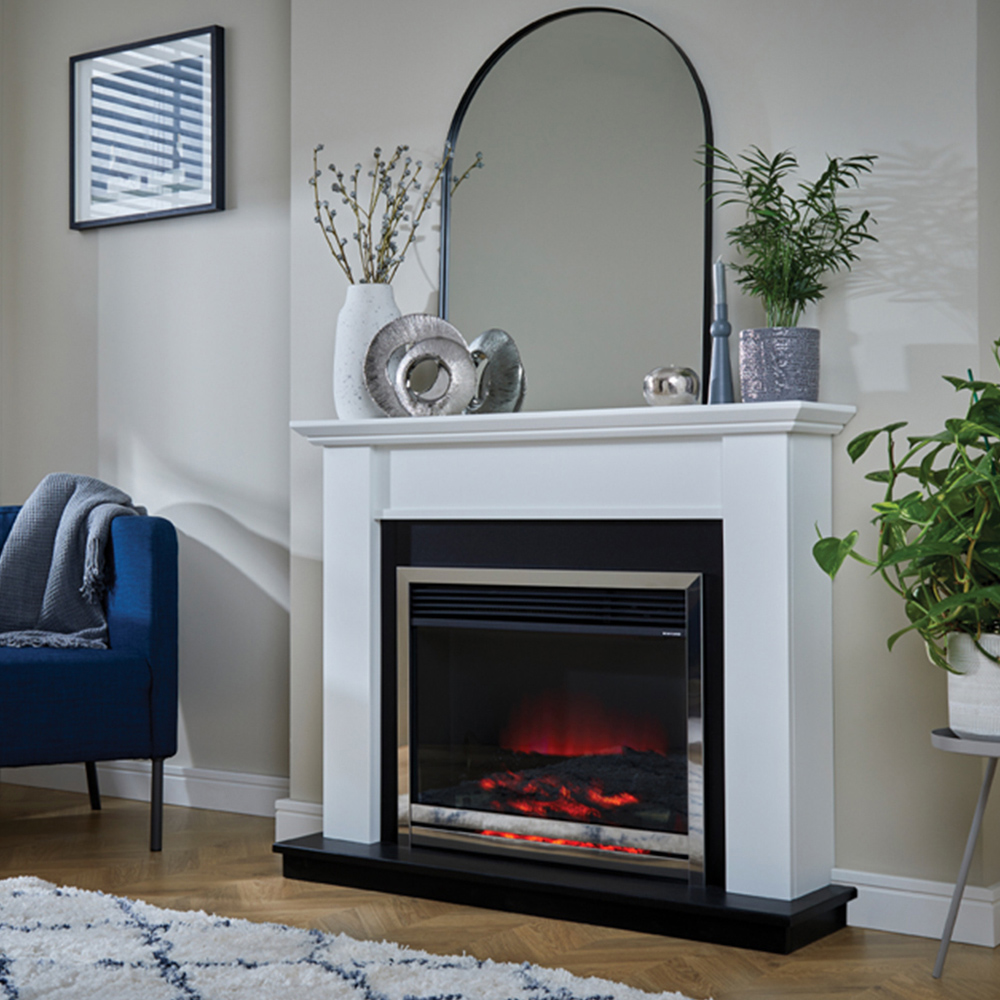 The Suncrest Antigua White and Black Textured Electric Suite is a traditionally styled, textured white electric fireplace and features an integrated electric fire with a stylish chrome trim against a graphite back panel and hearth. The energy-efficient LED flame effect, with three flame settings, realistically flickers glows and illuminates the glowing log bed beneath. If you want the flames without the heat, no problem – the flame effect-only setting will ensure you can sit back and enjoy the flames gently flickering without the heat. Supplied with a smart remote control, the electric fire produces up to 2kW of heat and features the latest EcoDesign energy-saving technology – a 7-day programmable timer, draught detection, adaptive start operation and meets EcoDesign standards. It is a flat-to-wall fireplace, does not require a chimney breast, comes fully assembled and is covered with a 1-year warranty.