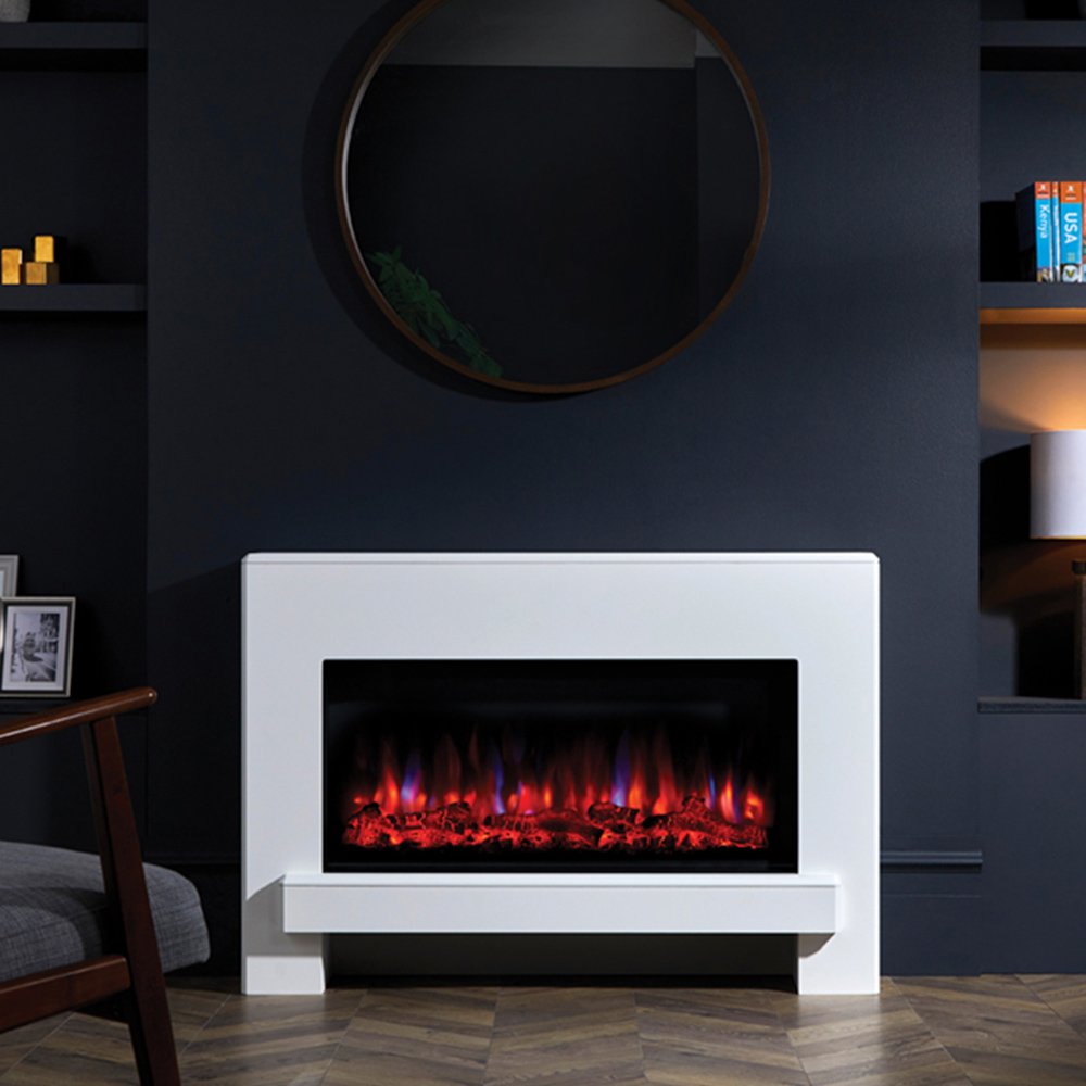 The Suncrest Eggleston White Textured Electric Suite is a beautiful fireplace which is perfect for modern and contemporary styled interiors. With a textured white finish, the neatly protruding shelf raises the fire for a perfect view of the realistic flames. The energy-efficient LED flame effect, with 3 flame settings, realistically flickers glows and illuminates the glowing log bed beneath. If you want the flames without the heat, no problem – the flame effect-only setting will ensure you can sit back and enjoy the flames gently flickering without the heat. Supplied with a smart remote control, the electric fire produces up to 2kW of heat and features the latest EcoDesign energy-saving technology – a 7-day programmable timer, draught detection, adaptive start operation and meets EcoDesign standards. It is a flat-to-wall fireplace, does not require a chimney breast, comes fully assembled and is covered with a 1-year warranty.