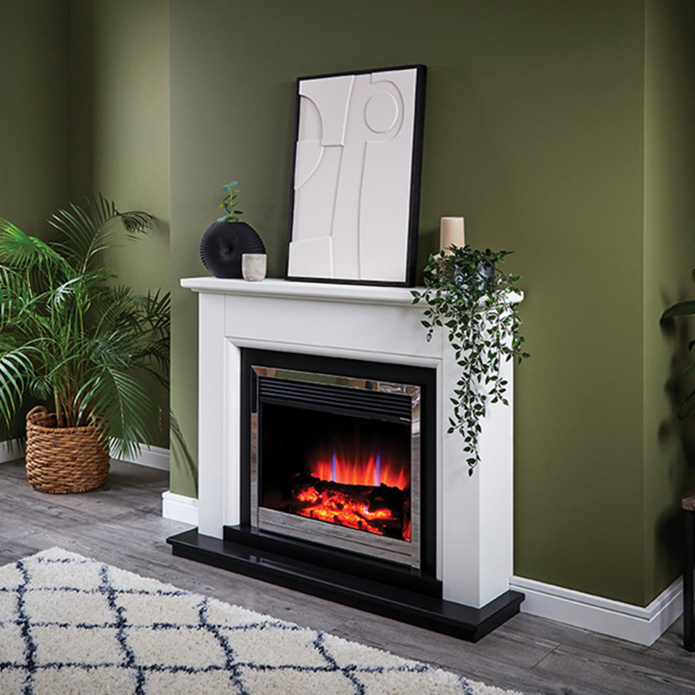 The Suncrest Talent White and Black Textured Electric Suite is a traditionally styled, textured white electric fireplace and features an integrated electric fire with a stylish chrome trim against a graphite back panel and hearth. The energy-efficient LED flame effect, with three flame settings, realistically flickers glow and illuminate the glowing log bed beneath. If you want the flames without the heat, no problem – the flame effect-only setting will ensure you can sit back and enjoy the flames gently flickering without the heat. Supplied with a smart remote control, the electric fire produces up to 2kW of heat and features the latest EcoDesign energy-saving technology – a 7-day programmable timer, draught detection, adaptive start operation and meets EcoDesign standards. It is a flat-to-wall fireplace, does not require a chimney breast, comes fully assembled and is covered with a 1-year warranty.