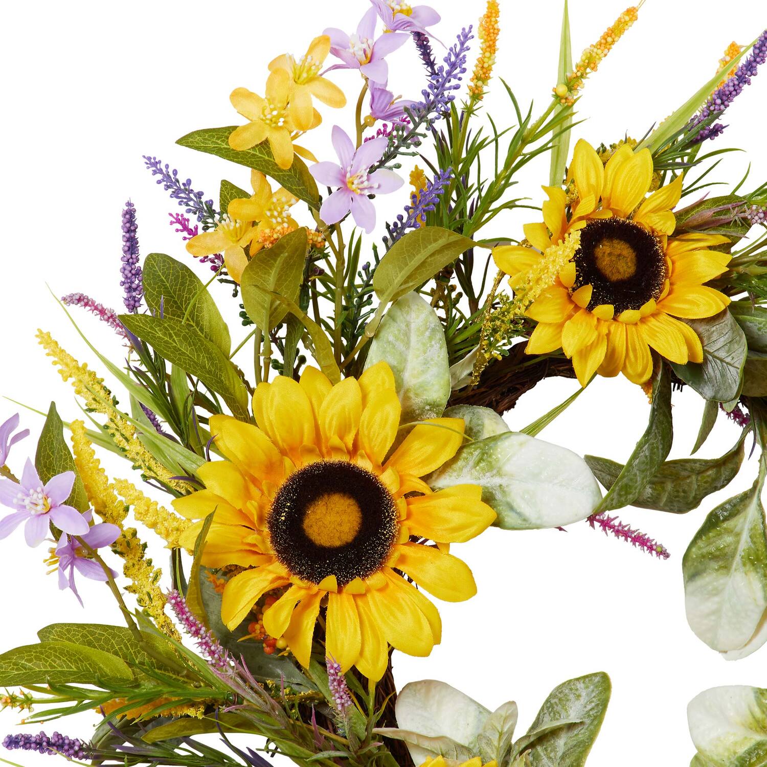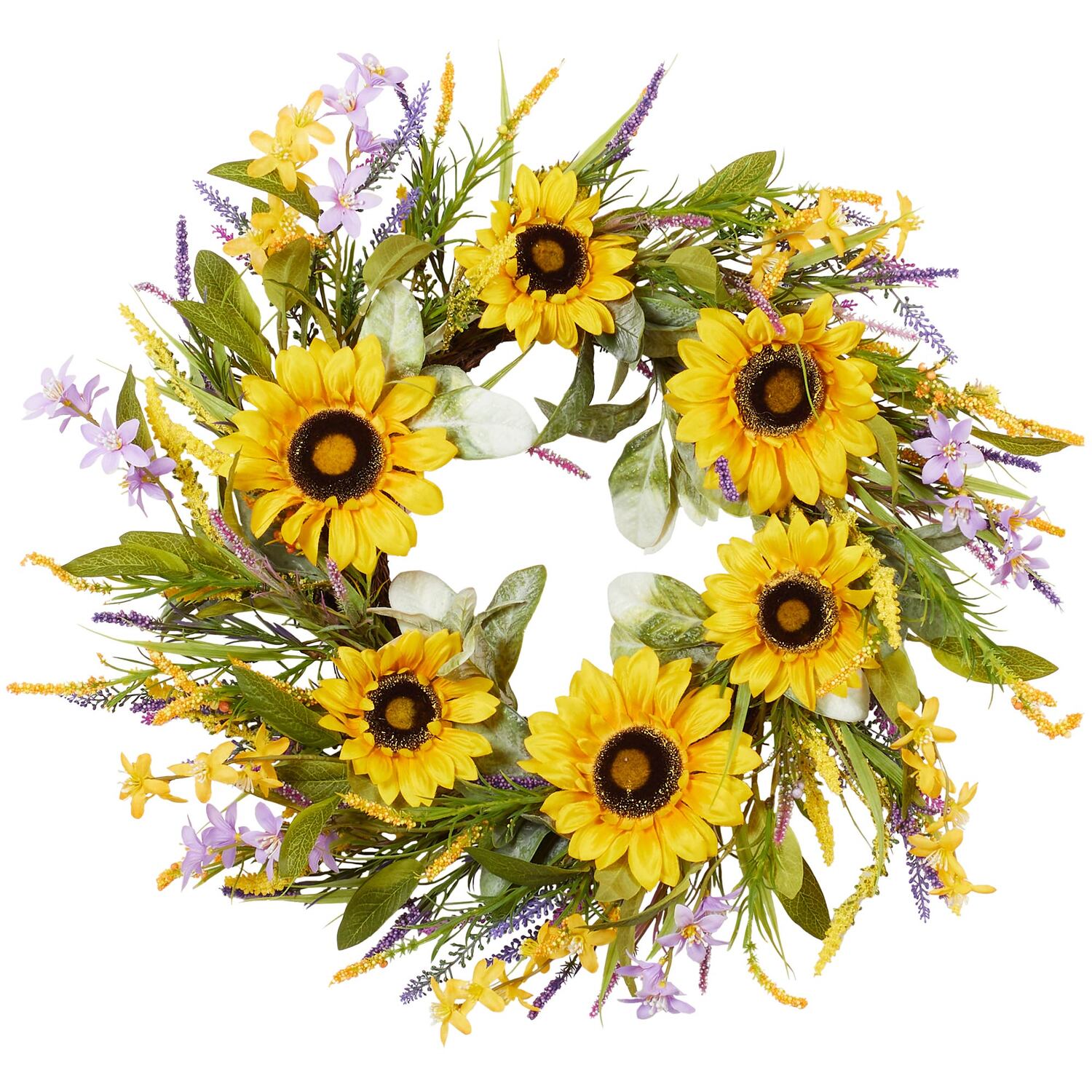 Brighten your home for spring and summer with the help of this beautiful Sunflower Wreath. This sunshine-yellow wreath has a lovely, bright, sunny design with faux sunflowers and coordinating blooms, ideal for those warmer months - bringing colour and charm to your space. This wreath can be hung on doors and walls or used as a centrepiece for dining or coffee tables. It's a must-have for lifting your spirits when the sun emerges!