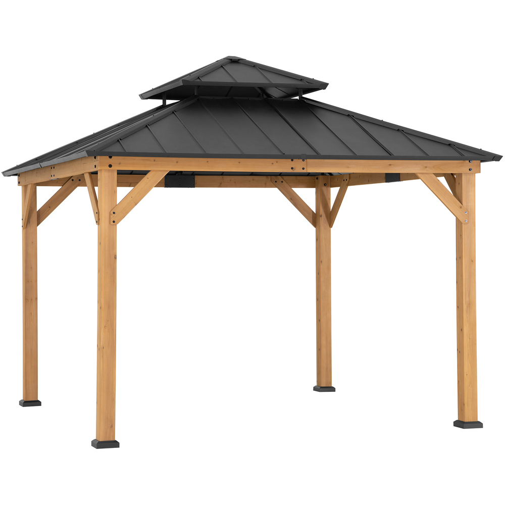 Expand your living space by bringing the indoors outside with the Sunjoy 3.3 x 3.3m Anthracite Cedar Wooden Gazebo with a 2-tier Steel Roof, creating the perfect end-of-the-day oasis for entertaining family and friends. This 330 x 330cm wooden gazebo, crafted by the world’s leading ready-to-assemble outdoor structure maker, Sunjoy, offers an ideal outdoor setting for any time of the year. Enjoy all four seasons under the chestnut-coloured cedar wood frame with an anthracite, powder-coated steel roof designed to withstand the elements. The two-tier roof provides optimal airflow while protecting against occasional inclement weather. Set the mood by suspending a chandelier from the incorporated ceiling hook for functional light and high design. With straightforward, easy-to-follow assembly instructions, you’ll be relaxing with your beverage of choice in your favourite new outdoor living space for years to come. Currently, we’re only able to deliver to United Kingdom mainland.