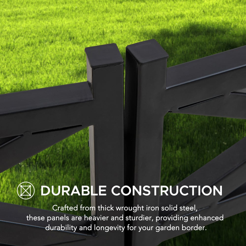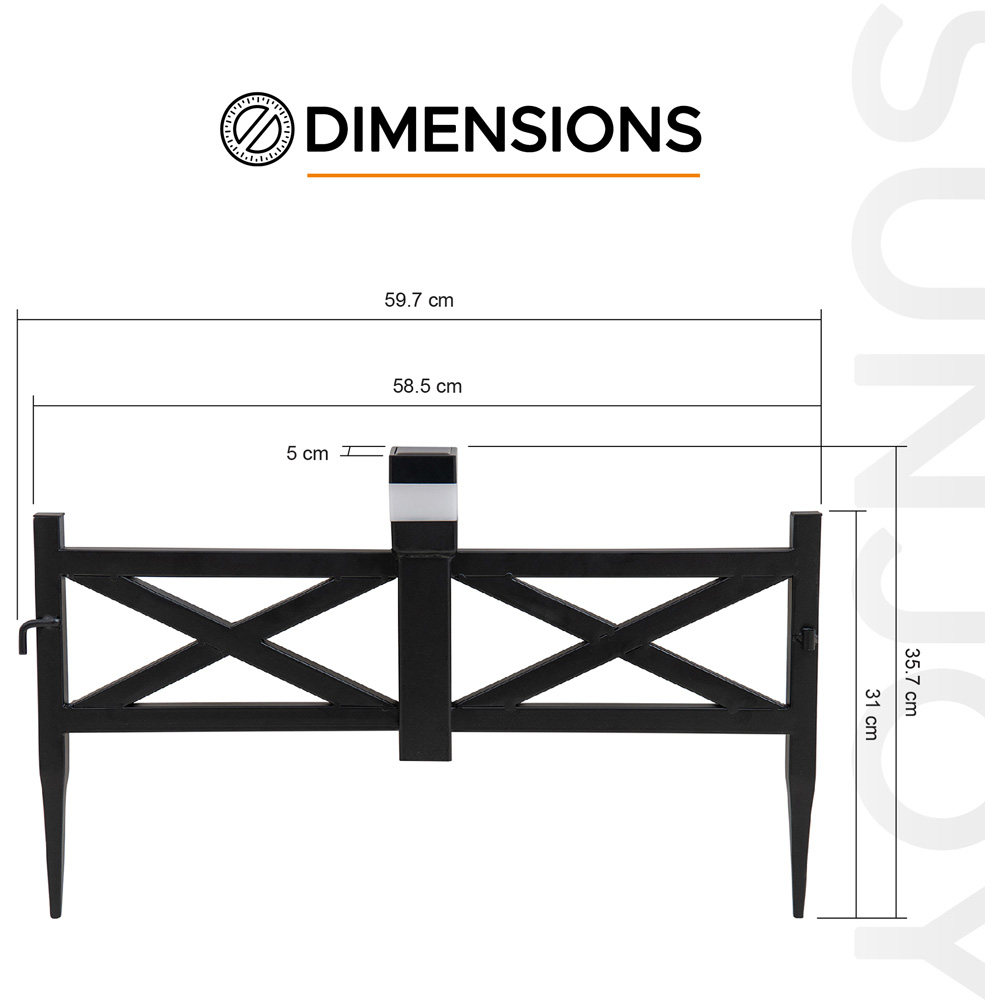 Introducing the Sunjoy Cromwell V.2 Solar Garden Border Fencing 2D, the perfect solution for enhancing your backyard while reducing electricity bills. With long-lasting solar panels requiring minimal maintenance, you'll enjoy energy savings for years to come. Each panel easily interlocks with the ring on the side, ensuring a secure connection without the need for tools or digging. Installation is a breeze – simply insert directly into the soil for instant transformation. Crafted from thick wrought iron solid steel, this modern lattice design adds elegance and durability to your outdoor space, making it the ideal choice for both style and functionality in any garden fencing solution.